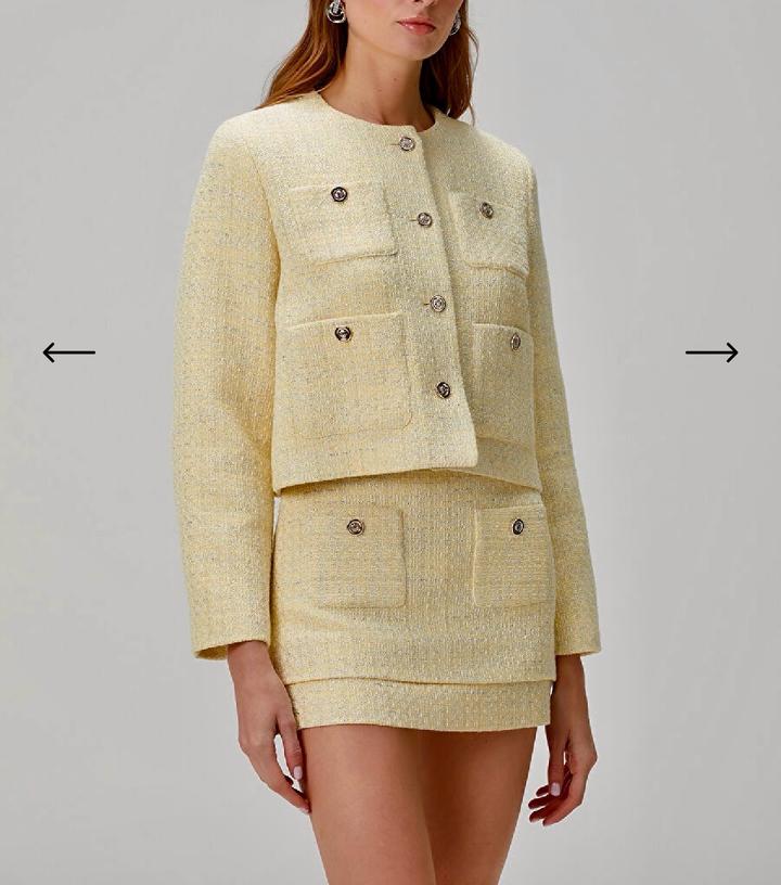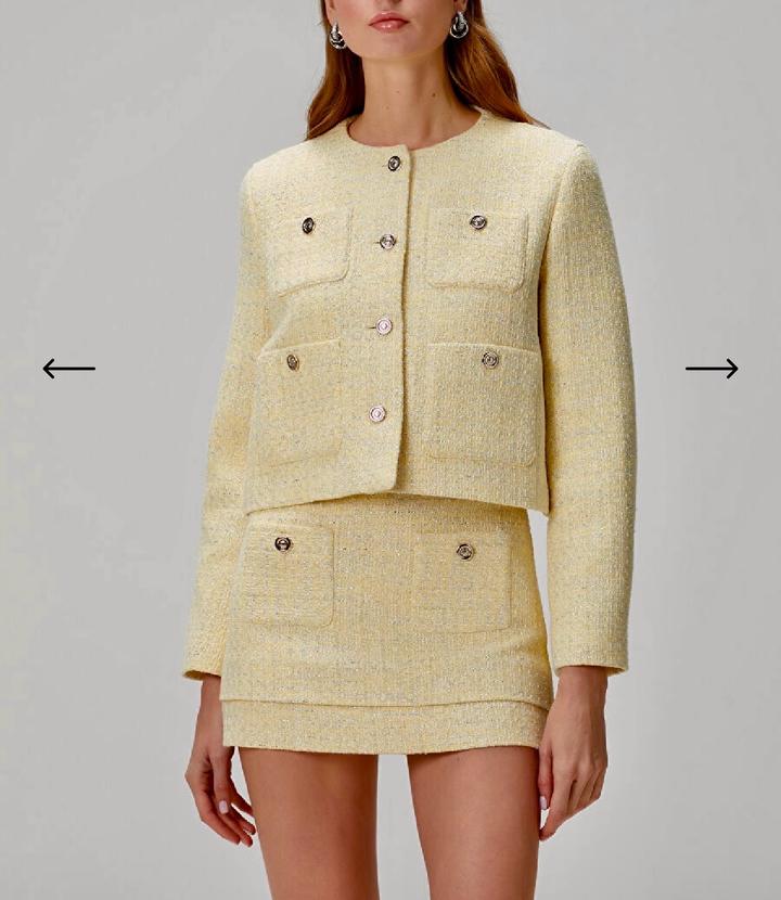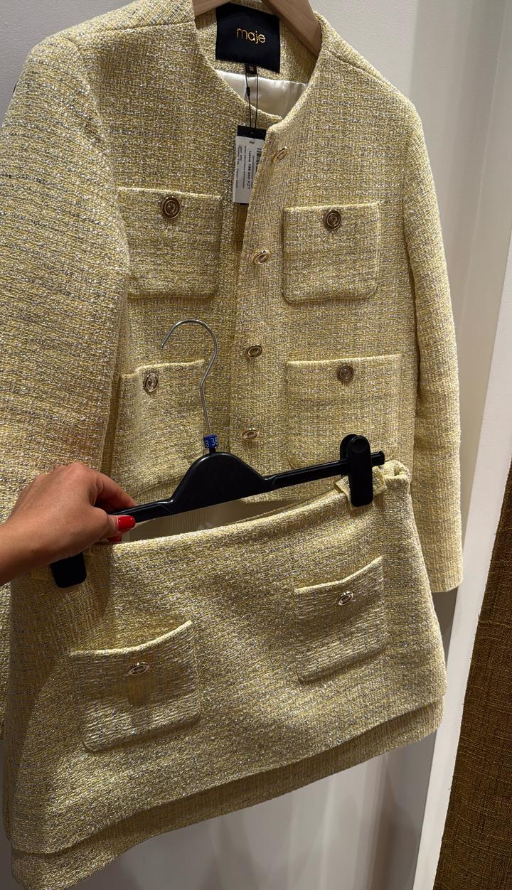 Костюм Maje в трендовом оттенке «сливочное масло». В идеальном состоянии, в носке 2 раза на пару часов. После химчистки. Пиджак 36 р(S-M), юбка 38р (больше М). Артикул: 410635