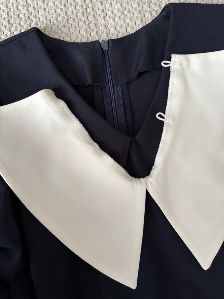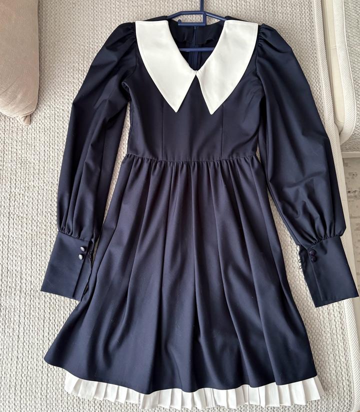 Темно-синее платье, шилось на заказ, в идеальном состоянии, в талии резинка есть (до 60см пойдет), воротник съемный, рукава длинные, в школу отлично подойдет Артикул: 410867
