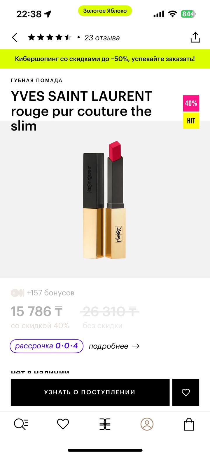 Продам помаду YVES SAINT LAURENT rouge pur couture the slim, оттенок 21 Rouge Paradoxe. Покупала в золотом яблоке, коробки нет, из за фин ситуации приходится продать. На губах смотрятся как красный цвет Артикул: 411447