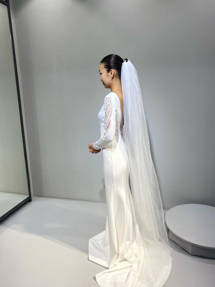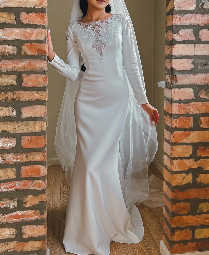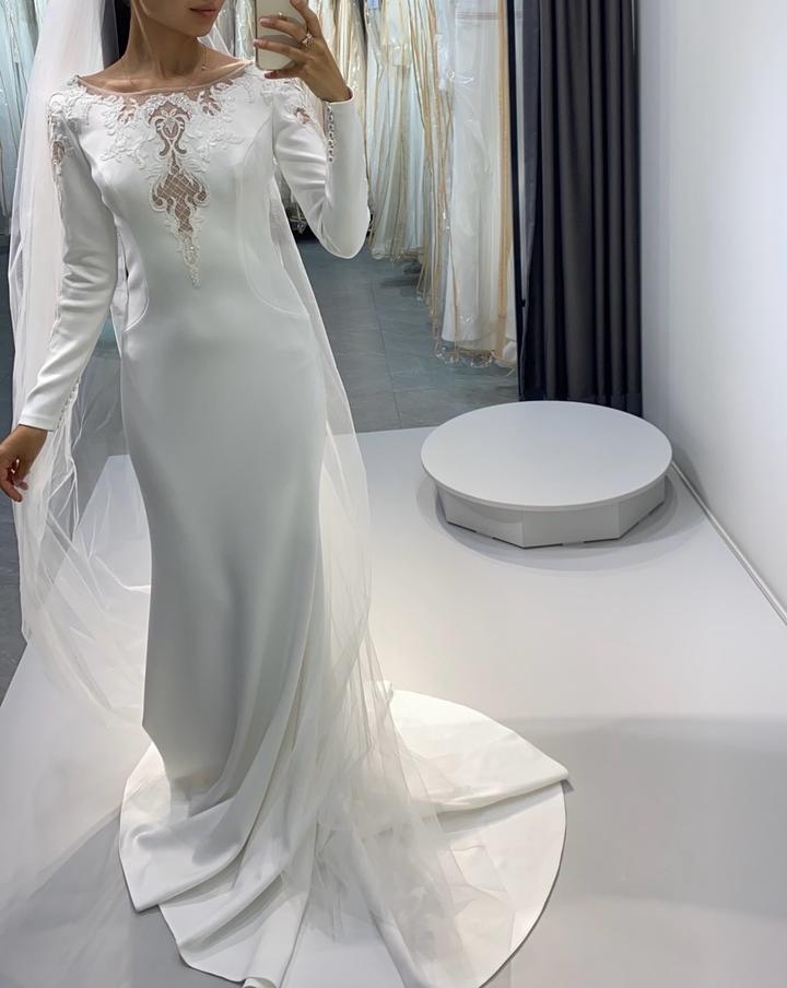 **Свадебное платье силуэта «рыбка»** Элегантное свадебное платье, подчёркивающее фигуру. Выполнено из гладкой матовой ткани, лиф украшен изысканным кружевом с прозрачными вставками. Длинные рукава с декоративными пуговицами добавляют образу утончённости и благородства. Нежный шлейф создаёт эффектный и торжественный силуэт. **Размер:** XS/S **Состояние:** надевалось один раз, в идеальном состоянии Артикул: 413731