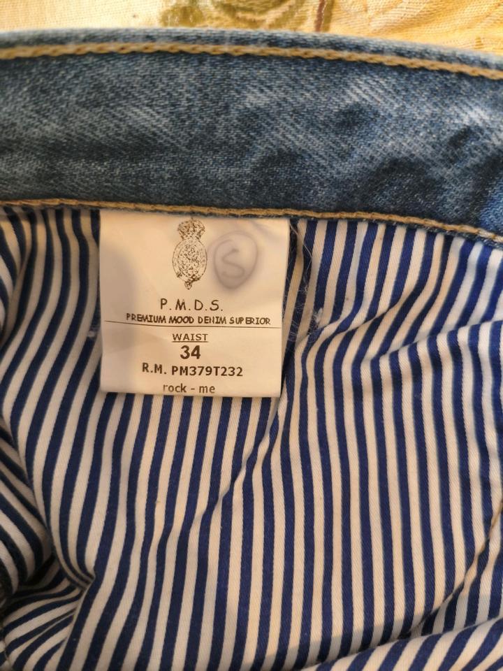 Джинсы премиального итальянского бренда P.M.D.S.-синоним высокого качества и креативности. Логотип марки украшен короной ,а её название -Premium Mood Denim Superior -Премиальное джинсовые настроение. Дорогой бренд,стоимость начинается с 300€,производится только в Италии.Джинсовый размер 34,абсолютно новые,на пломбе Артикул: 413816