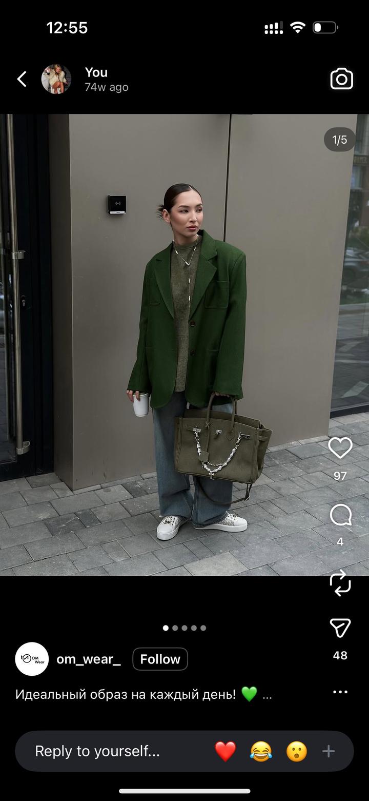 Оливковая сумка из денима, который айфон постоянно меняет на Дениса. Ни один Денис при изготовлении сумки не пострадал!!! Сумка необычная, носить ее мне некуда, обидно, что она пылится в шкафу, хотя может украшать образы какой-нибудь леди вроде тебя 💚 Когда я ее покупала, именно за этим цветом прямо охота шла в инсте, я ее урвала буквально. Так что сумочка заряжена удачей. Артикул: 414807
