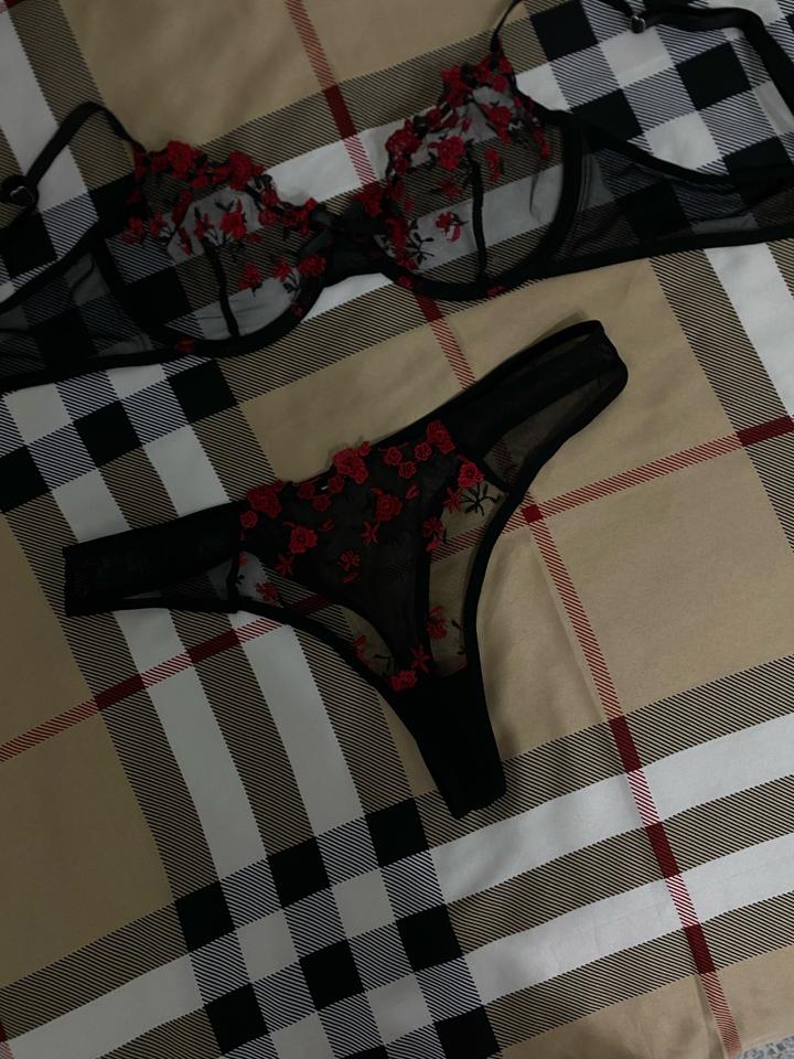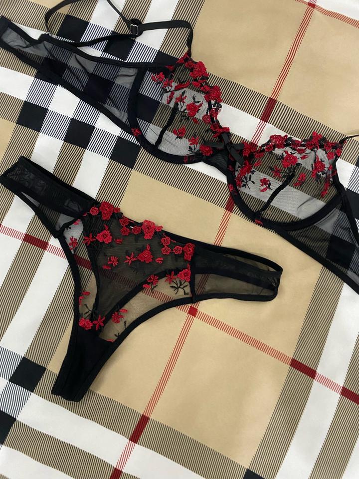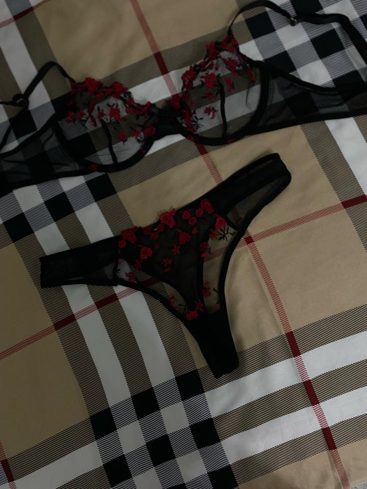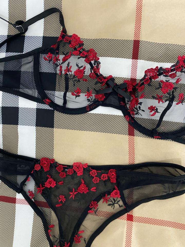 Комплект нижнего белья (бюстгальтер + трусики) Элегантный комплект чёрного цвета с красной вышивкой. Полупрозрачная сетка, аккуратные цветочные детали, подчёркивает фигуру и смотрится очень женственно. 🌹 Цвет: чёрный с красной вышивкой 🌹 Состояние: отличное 🌹 Мягкий бюстгальтер без пуш-ап 🌹 Идеален как для особого случая, так и для уверенности в себе каждый день Артикул: 417924