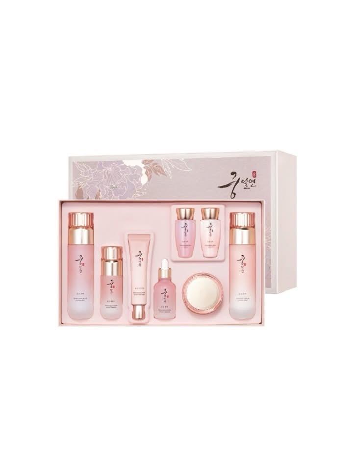 Премиальный набор ухода за кожей Coreana Gungseolyeon Yunseol Premium Herbal 6 Set. 🇰🇷Южная Корея Состав набора: - тонер (120 мл + мини 30 мл) -эмульсия (120 мл + мини 30 мл) -сыворотка 40 мл -эссенция 40мл -крем для глаз 30г -крем для лица 50 мл+ 2 мини 20 мл Состав -аденозин — одобренный для борьбы с морщинами; -фильтрат муцина — улучшает эластичность и структуру кожи; -экстракты корейских трав: хасуо (корень), гриб чага, лакричник, цветочный гриб, пионы, дудник и др.; -трегалоза, гиалурон. Артикул: 418176