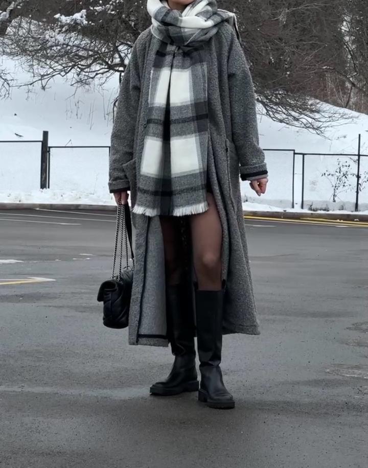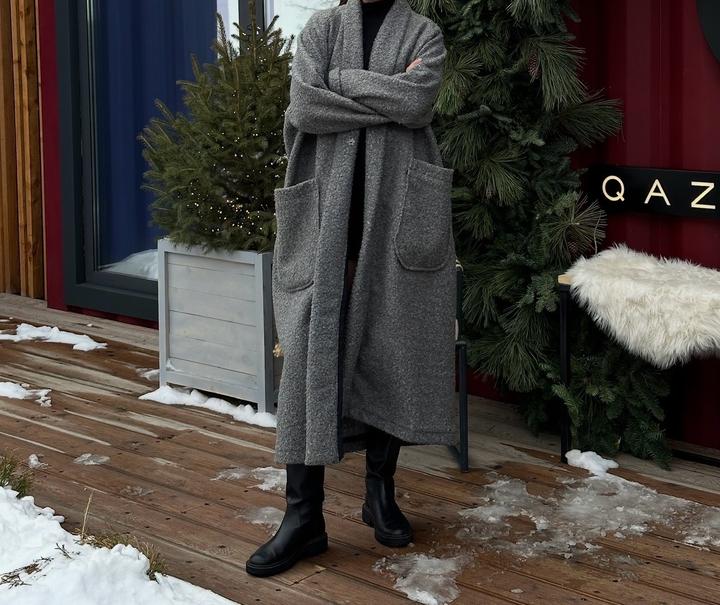 Букле 45%, шерсть 25%. Теплое. Свободный крой, мягкое плечо, большие карманы. Покупала за 100 000 тенге. Мой рост 173 Артикул: 420081