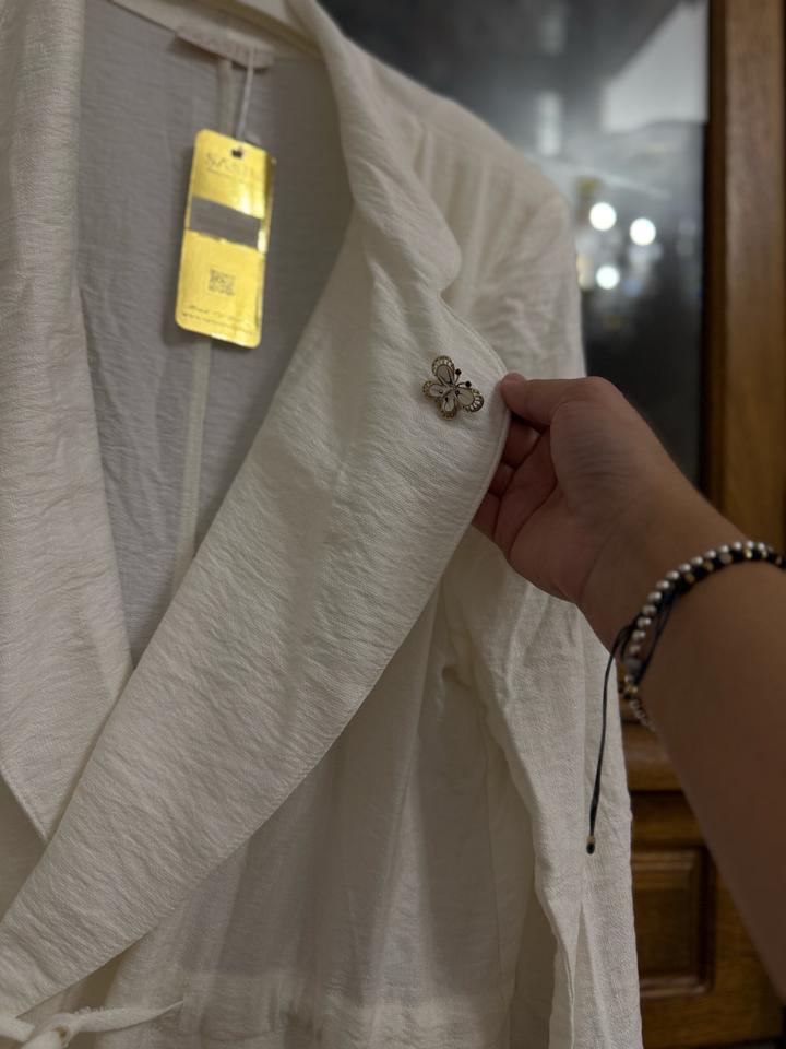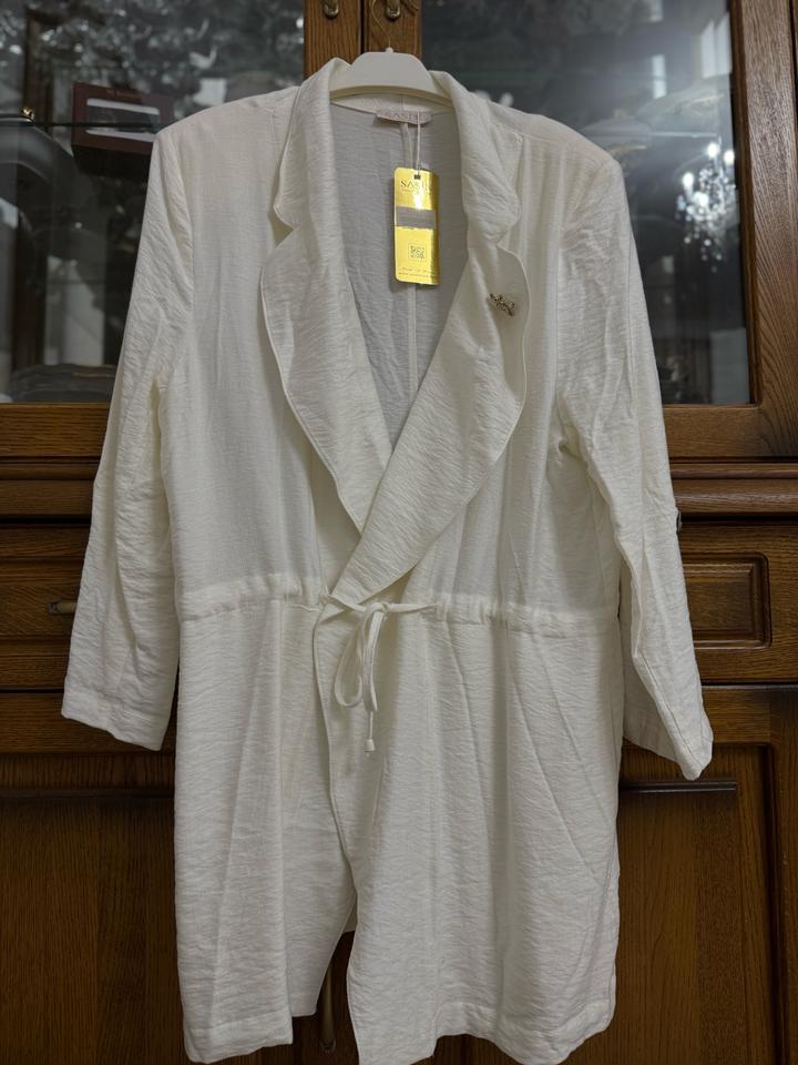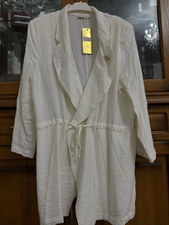Накидка новая, белого цвета. Размер 54. В талии есть тонкий пояс, можно красиво подчеркнуть фигуру. Рукава 3/4, регулируются и фиксируются с пуговицей. На воротнике есть брошка. Лёгкая, тонкая, отлично подойдёт для тёплой погоды. Артикул: 420221