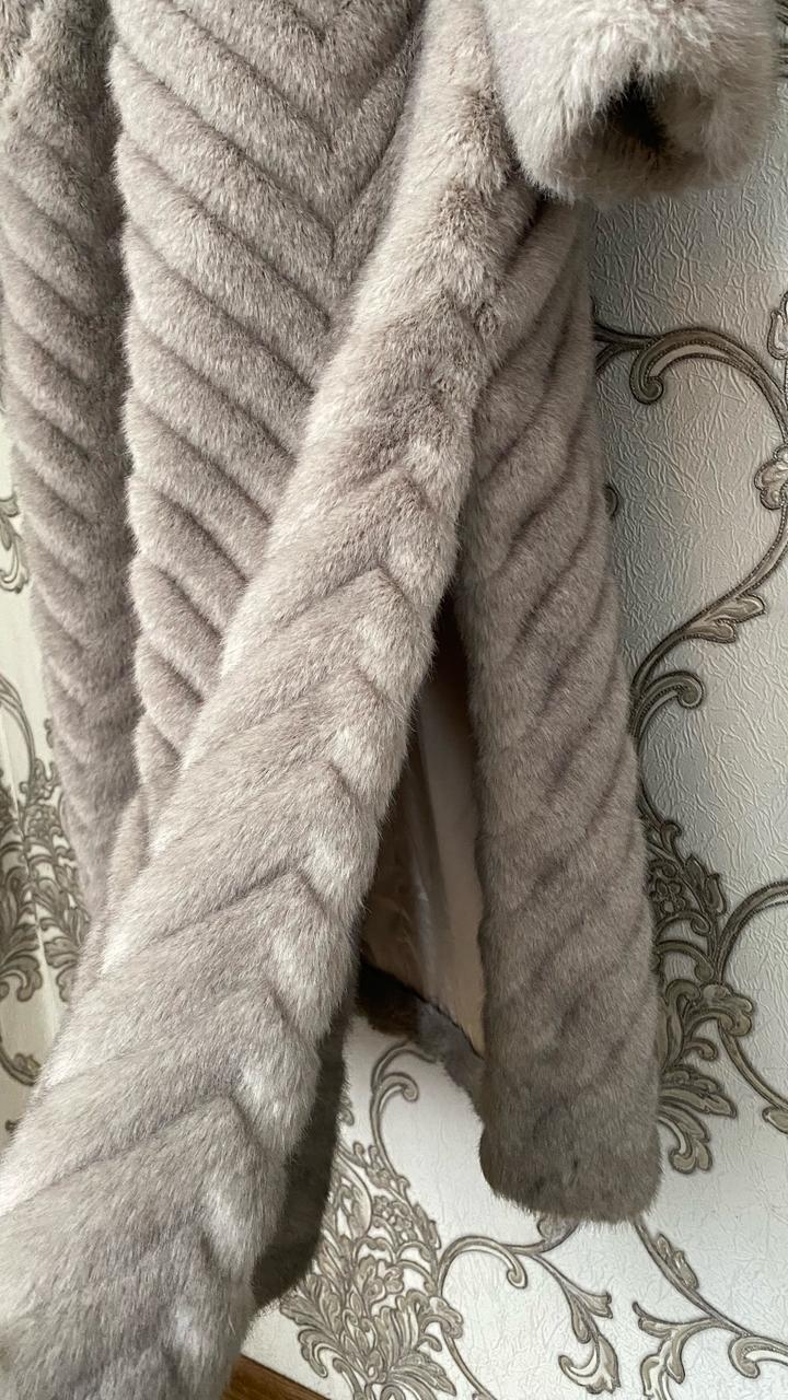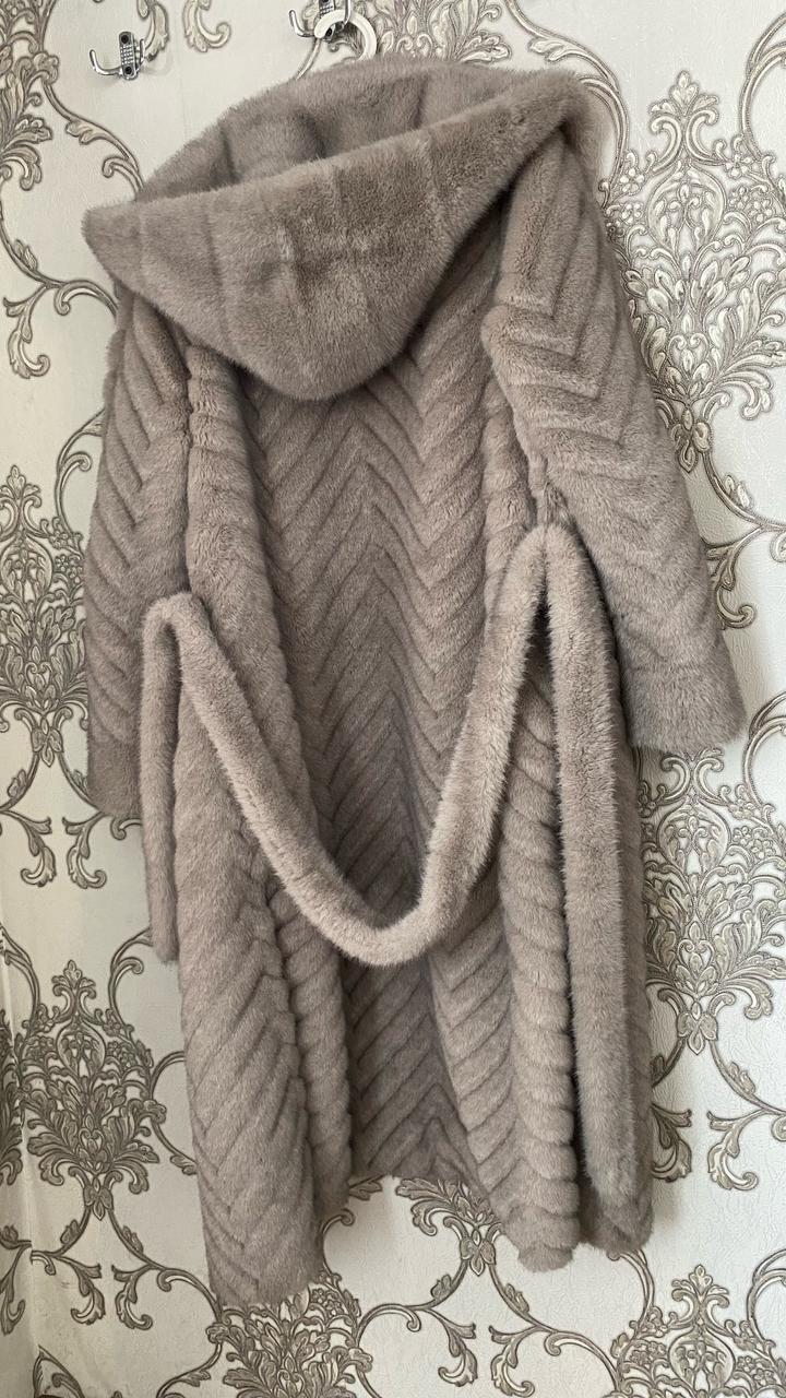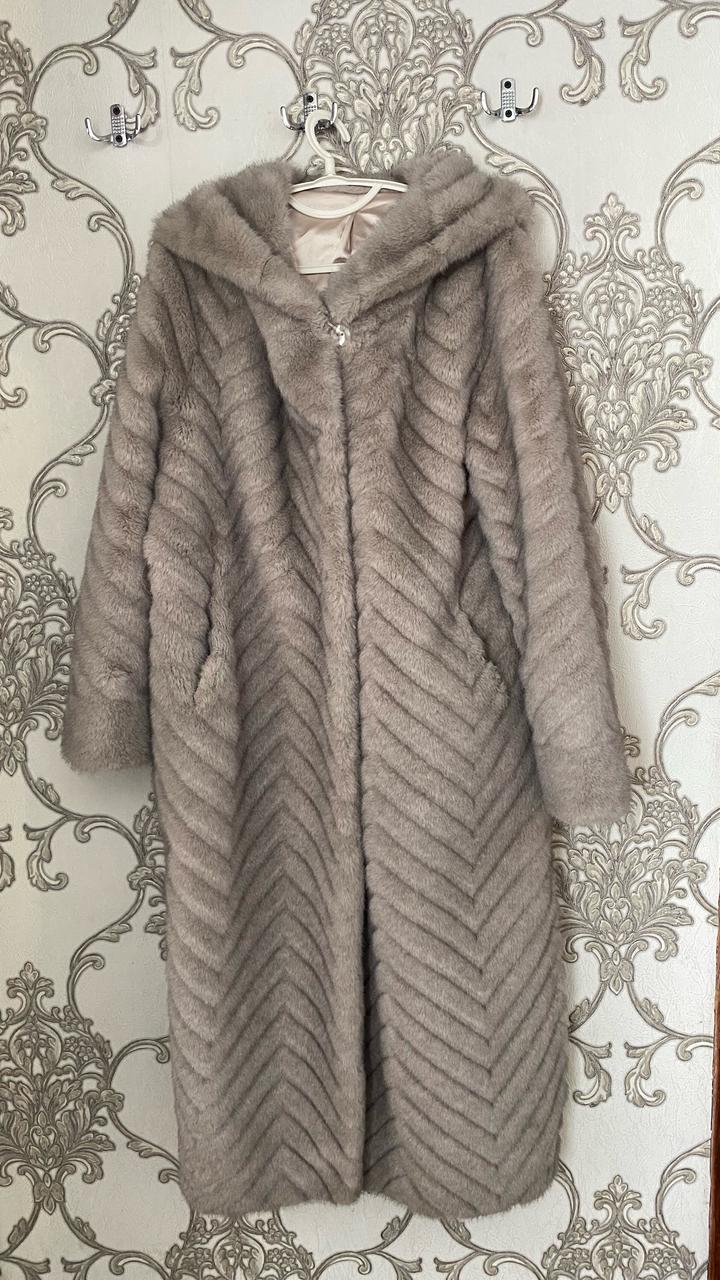 искусственный мех, есть капюшон и пояс, по бокам разрезы размер 48, длина по спинке 122 см Артикул: 420714