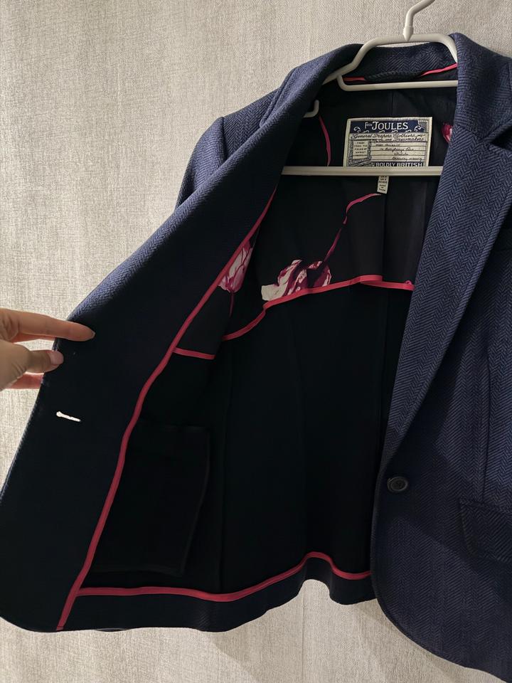 Твидовый пиджак (жакет) классического кроя темно-синего цвета от премиального британского бренда Joules (оригинал), в идеальном состоянии, носился 2 раза, подойдет на размер XS, дефектов нет, качество ткани очень хорошее Артикул: 421367