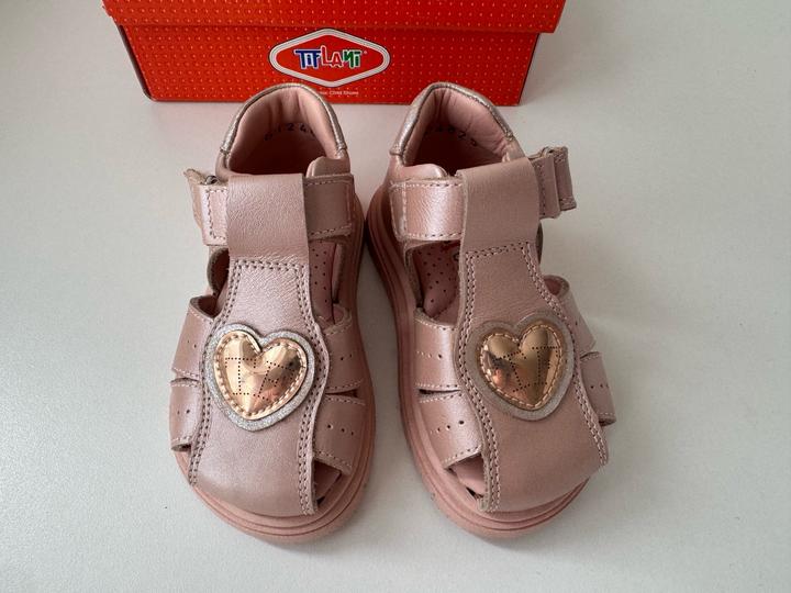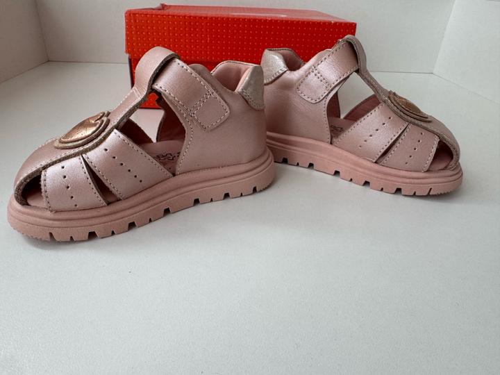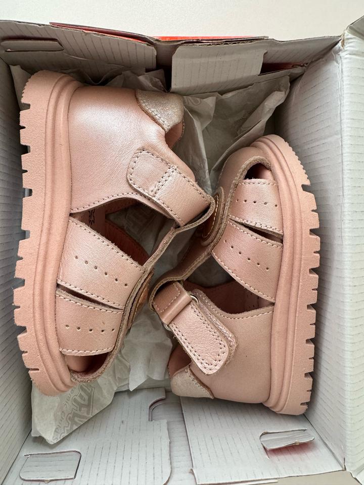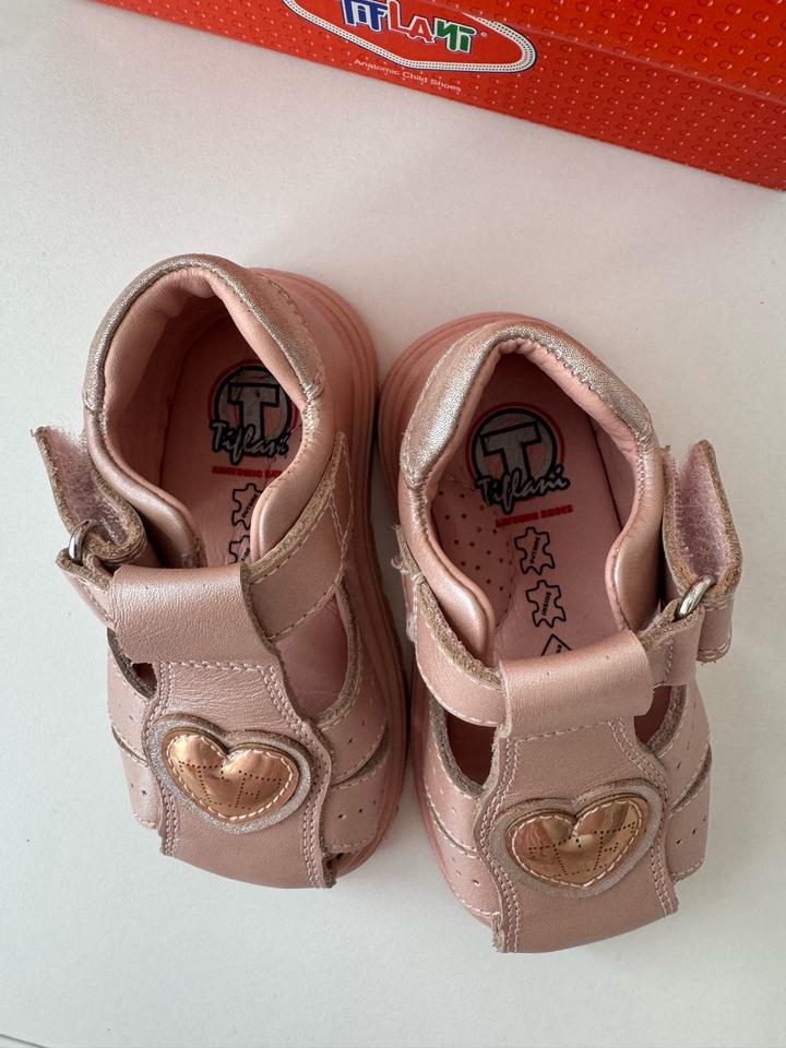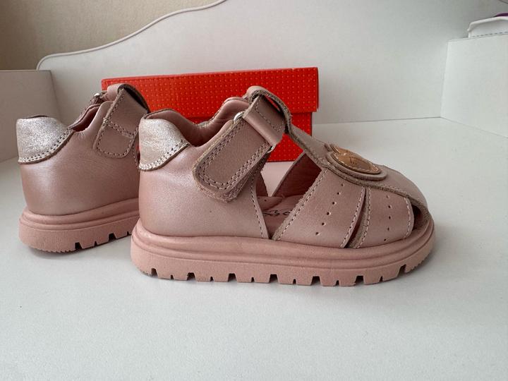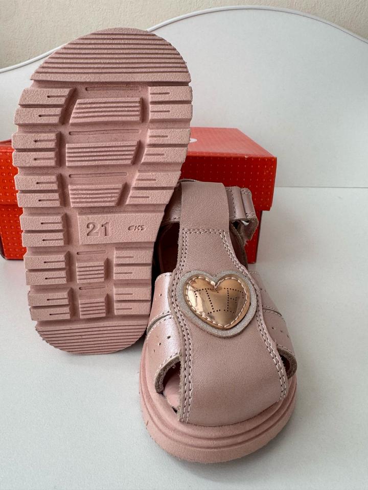 Розовые сандалии для девочек, выполнены из натуральной кожи. Закрытый носок. Удобные застёжки на липучках и ортопедическая подошва. Новые. Не ношенные! Размер на стопу 13см Артикул: 427367