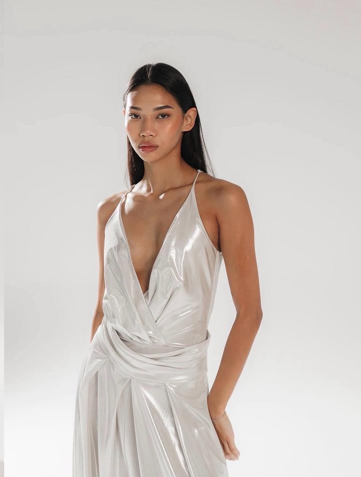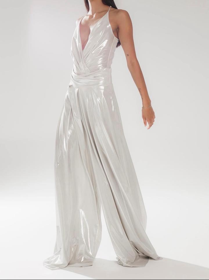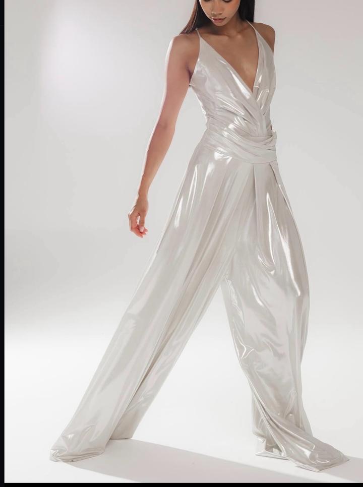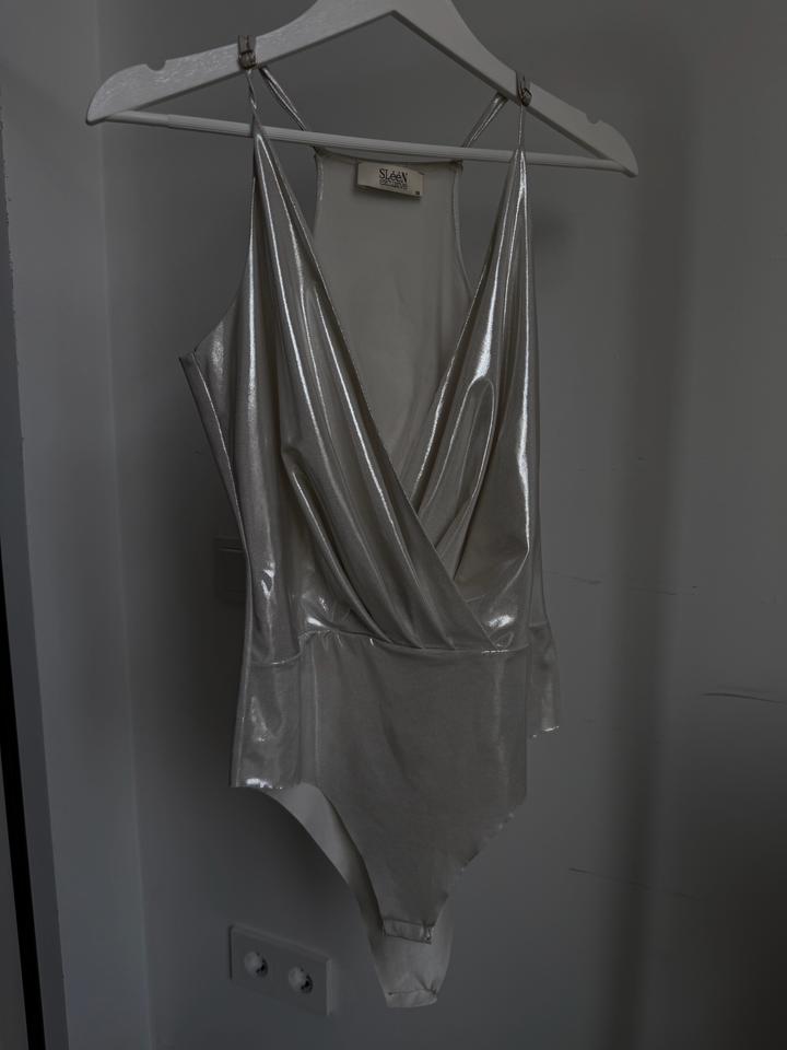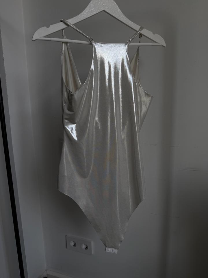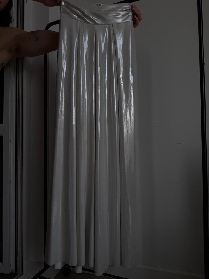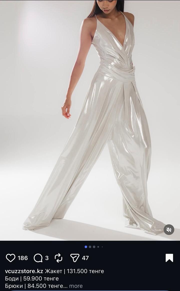 Бело-серебряный блестящий костюм на ваше праздничное мероприятие Боди + супер широкие длинные штаны на молнии Подойдут для каблуков Надевала один раз на мероприятие Больше не нужно Артикул: 427415