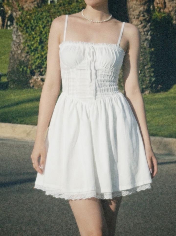 Белое летнее мини-платье с акцентом на талию и лёгкой пышной юбкой. Лиф выполнен в корсетном стиле с аккуратной сборкой и тонкими бретелями, красиво подчёркивает силуэт. Юбка свободная, с нежным кружевом по краю, за счёт чего платье выглядит очень женственно и воздушно. Ткань лёгкая, приятная к телу, отлично держит форму и не просвечивает. Идеально подойдёт для прогулок, свиданий, отпуска и фотосессий. Состояние отличное. Артикул: 427969