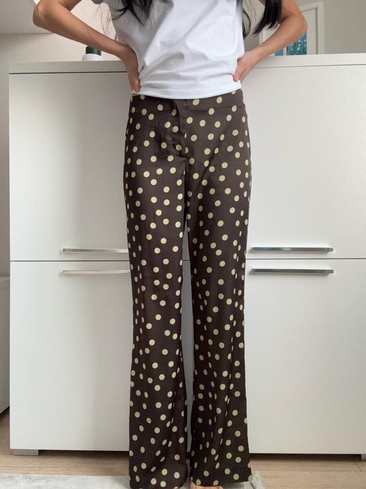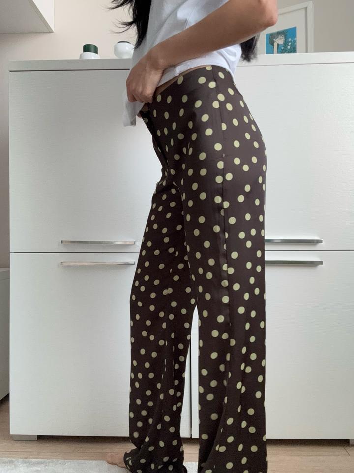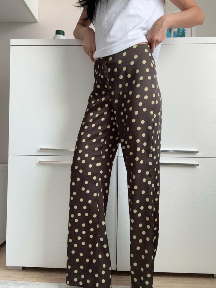 Атласные брюки в горох — стильный и эффектный вариант для тех, кто любит необычные детали. Средняя посадка, застёжка на молнию и внутреннюю пуговицу. Артикул: 428888