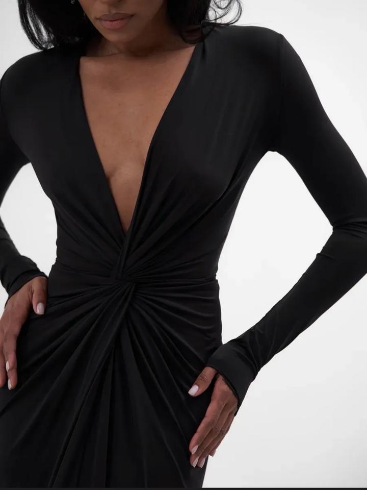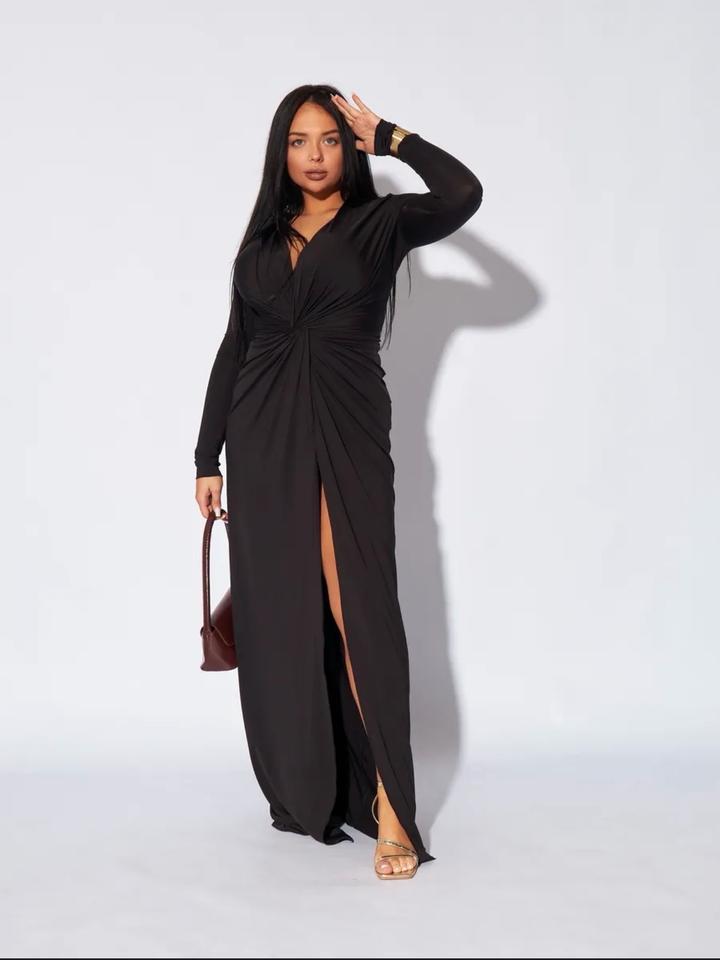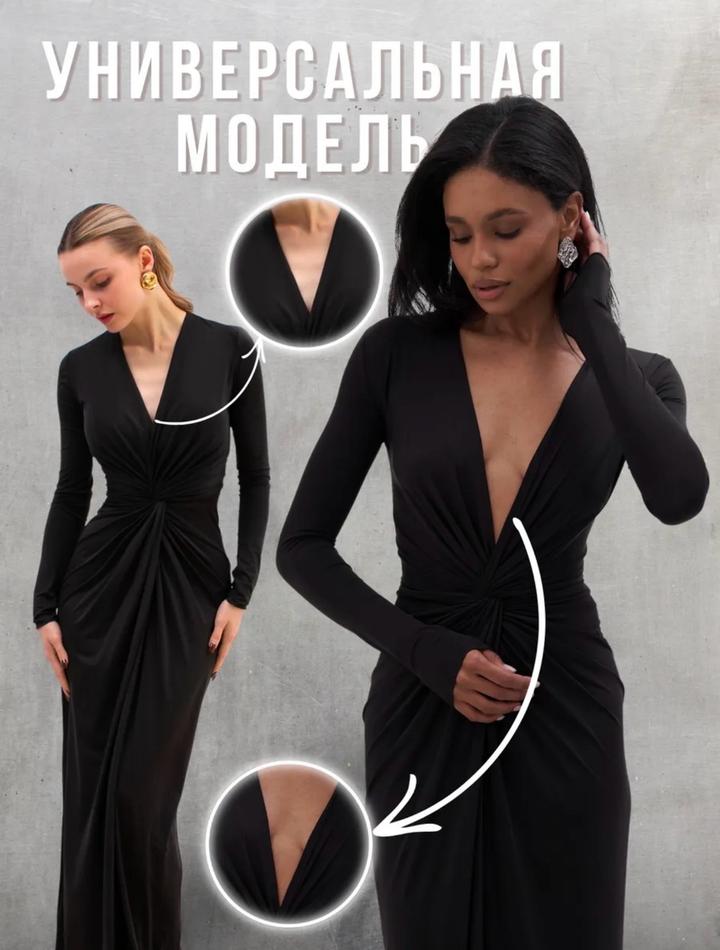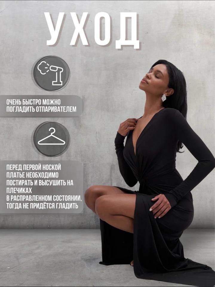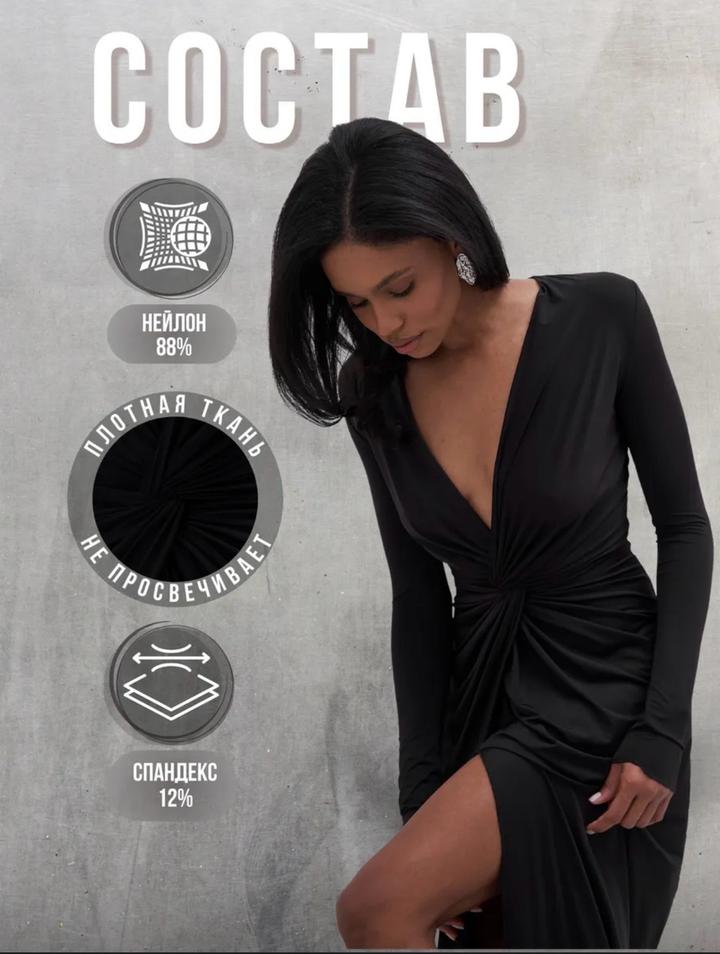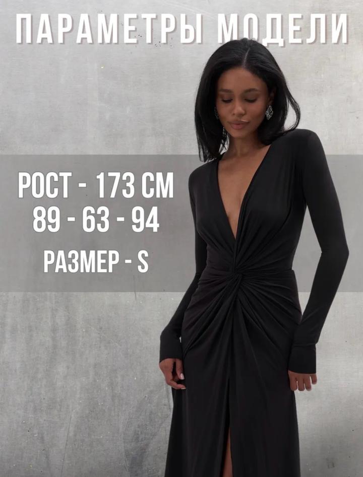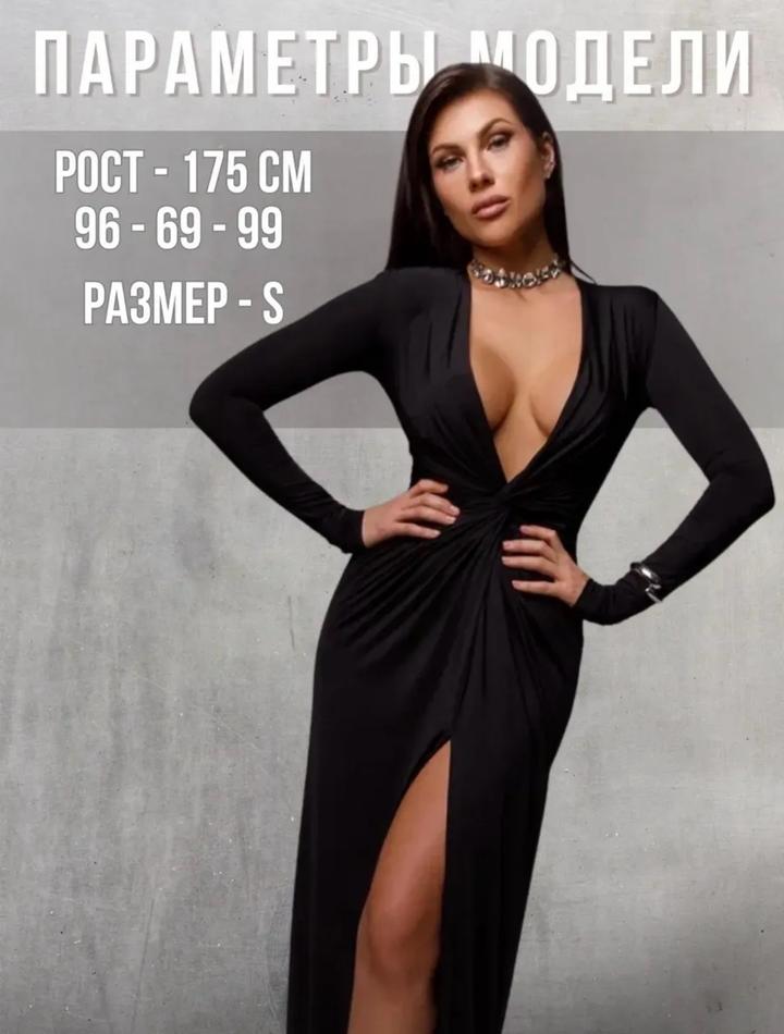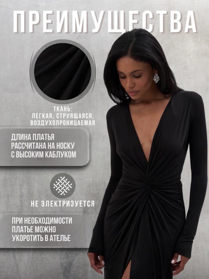 Чёрное, элегантное и очень женственное. Глубокий V-вырез подчёркивает зону декольте, драпировка красиво моделирует фигуру, а высокий разрез добавляет образу сексуальности и уверенности. Длинный рукав делает образ утончённым и благородным — идеально для вечеринок, мероприятий и особых выходов.Ткань холодок приятная к телу.Приобреталось к образу для фотосессии. Артикул: 429173