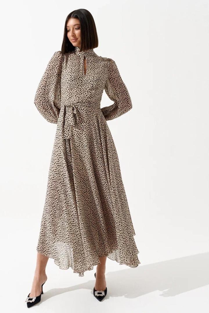 Женственное платье миди с лёгкой, струящейся юбкой и аккуратным анималистичным принтом. Приталенный силуэт с поясом подчёркивает талию, а высокий ворот и декоративный вырез добавляют образу элегантности. Модель подходит для повседневных выходов, мероприятий и деловых встреч. Распродажа, размер - 44 Артикул: 430829