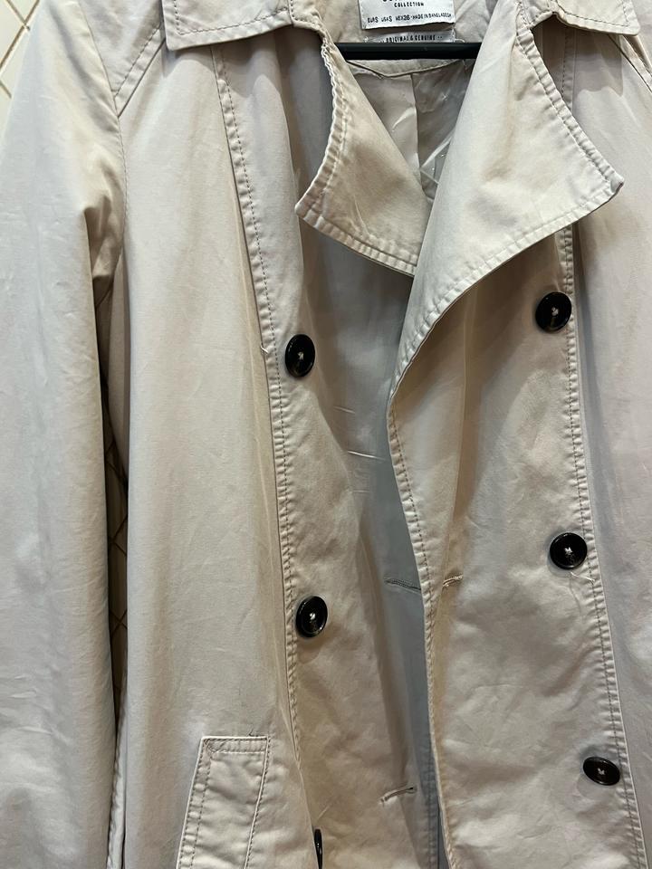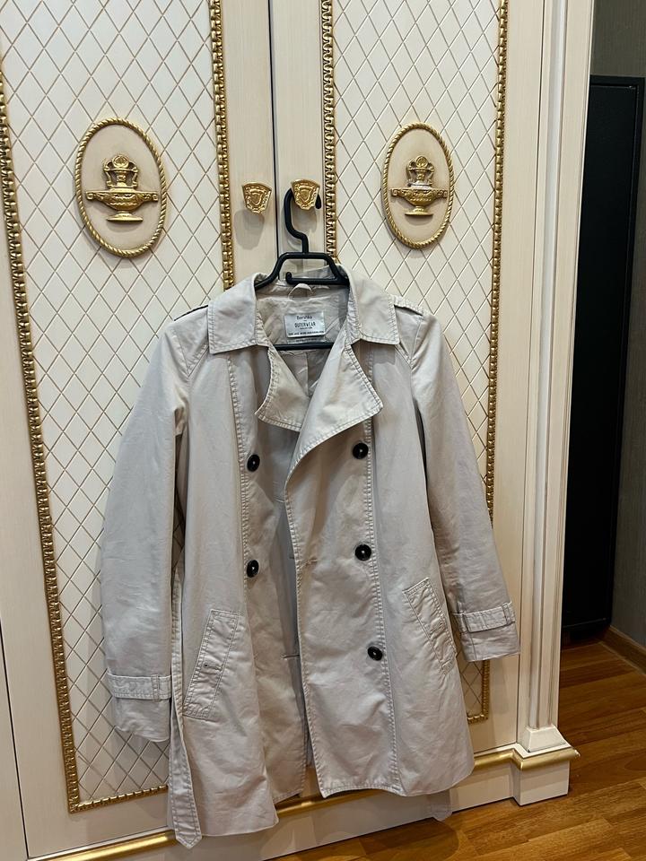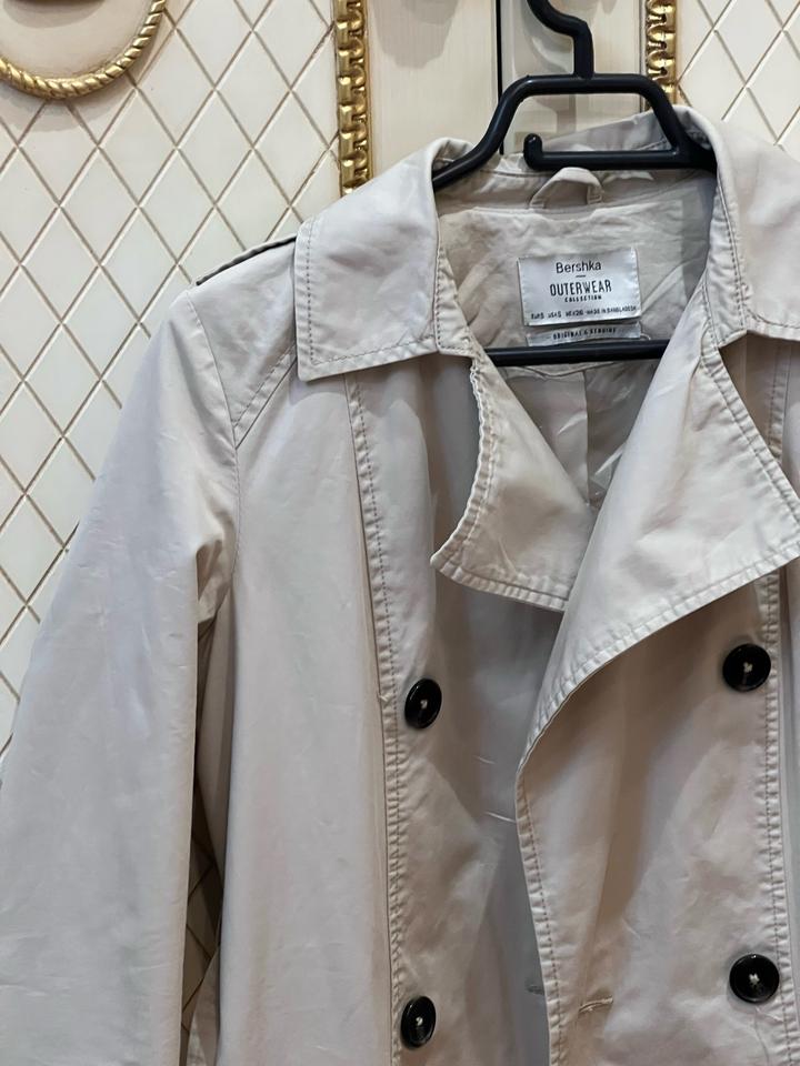 Тренч / плащ Bershka Классический двубортный тренч светло-бежевого цвета. Лёгкий, универсальный, идеально подойдёт для весны и осени. Прямой крой, аккуратный воротник, карманы, манжеты с декоративными хлястиками. Легко сочетается как с джинсами и кроссовками, так и с более классическими образами. Артикул: 432863