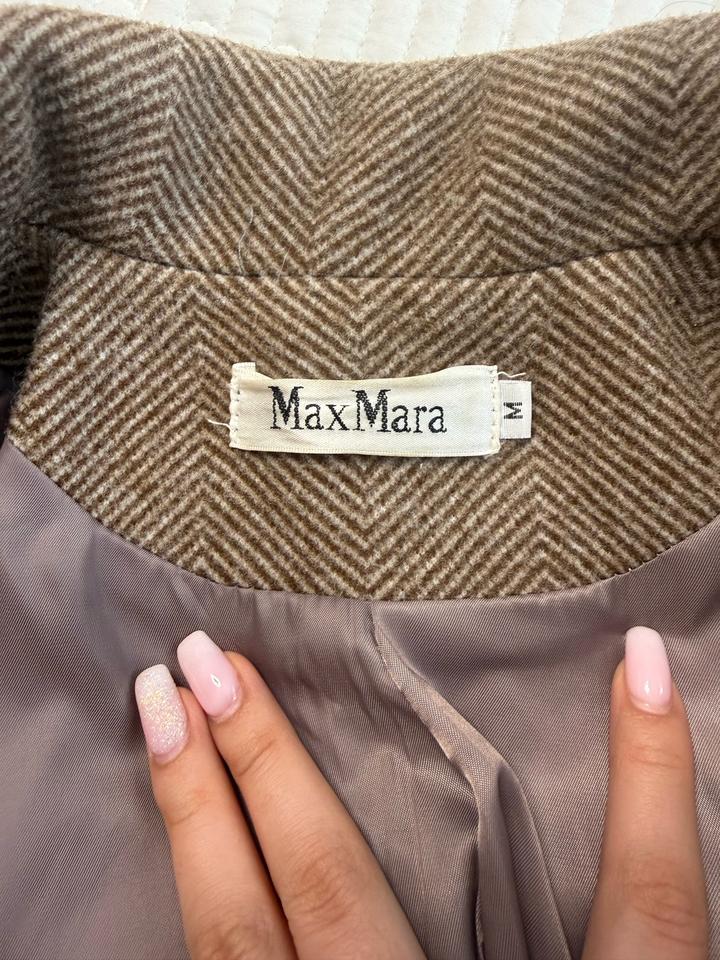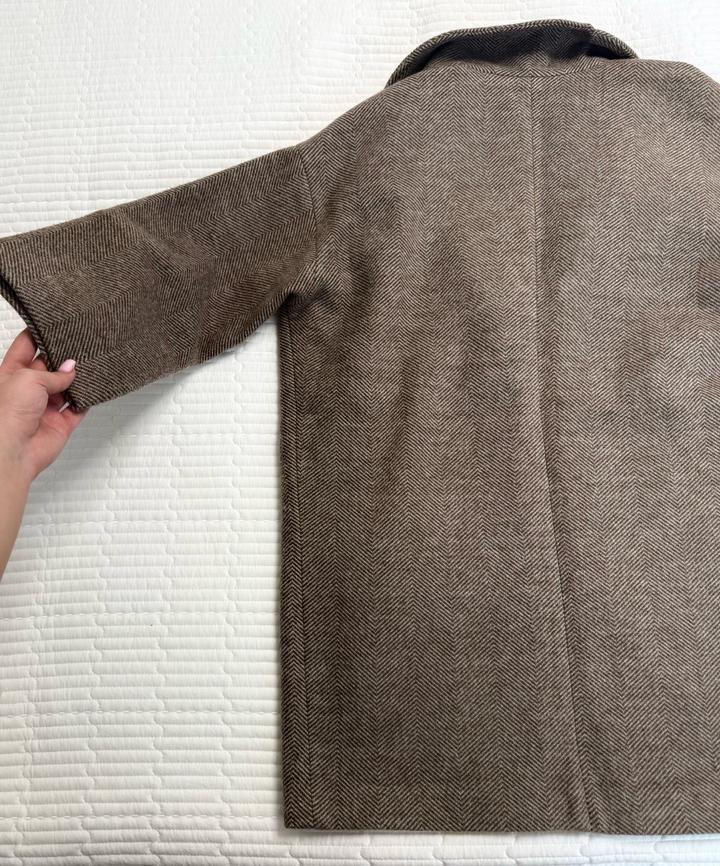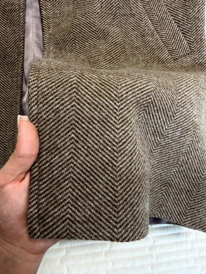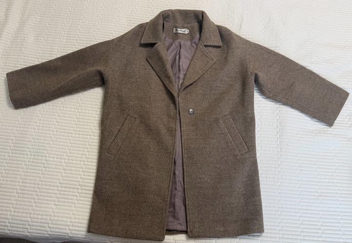 Коричневое полу-пальто, узор у него Елочка, рукава 3/4 четверти, длина пальто 80см. Подойдет на весну и теплую осень. Артикул: 433337