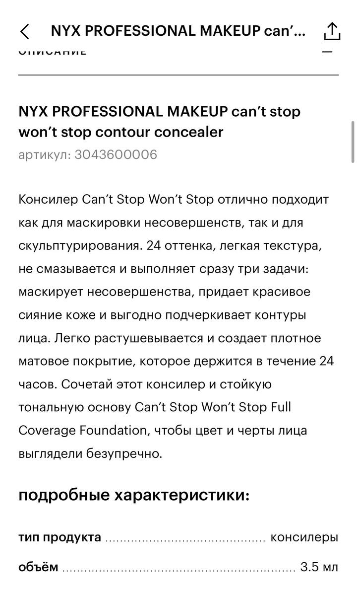 NYX PROFESSIONAL MAKEUP can’t stop won’t stop contour concealer Стойкий жидкий консилер для лица Цвет не подошел , в использовании не был , только проба Больше интересных вещей у меня в профиле , заглядывай 💛 Приятных покупок 💛 Благодарю что уделили время и внимание моей страничке 💛 Артикул: 435603