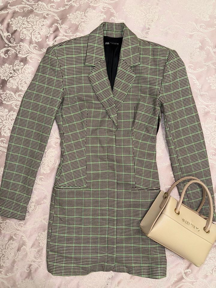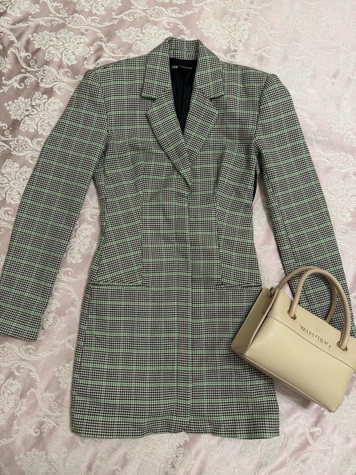 Стильное платье-пиджак в клетку от Zara. Элегантный приталенный крой подчёркивает фигуру, плотная ткань хорошо держит форму. Подходит как для офиса, так и для вечерних выходов. Длина мини (но не экстра). Смотрится дорого и современно. Состояние отличное. Артикул: 435666