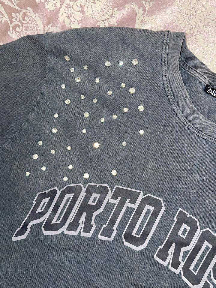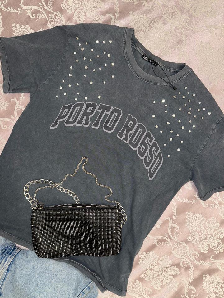 Стильная футболка Zara в графитовом оттенке с надписью Porto Rosso и декоративными стразами ✨ Модный оверсайз-крой, мягкий хлопок, эффект «варёной» ткани. Отлично сочетается с джинсами и аксессуарами. Подойдёт для повседневных и вечерних образов. Состояние новой футболки. Артикул: 435703