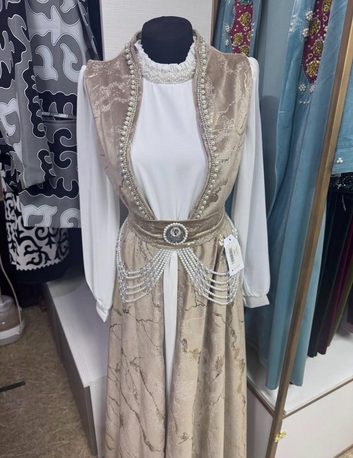платье с камзолом ручной работы на кыз узату , размер 48 ( маломерит , 46-48) , камзол полностью вышит в ручную , декор тоже ручной работы , в наборе белое платье с поясом и камзол с поясом , в идеальном состоянии Артикул: 436040