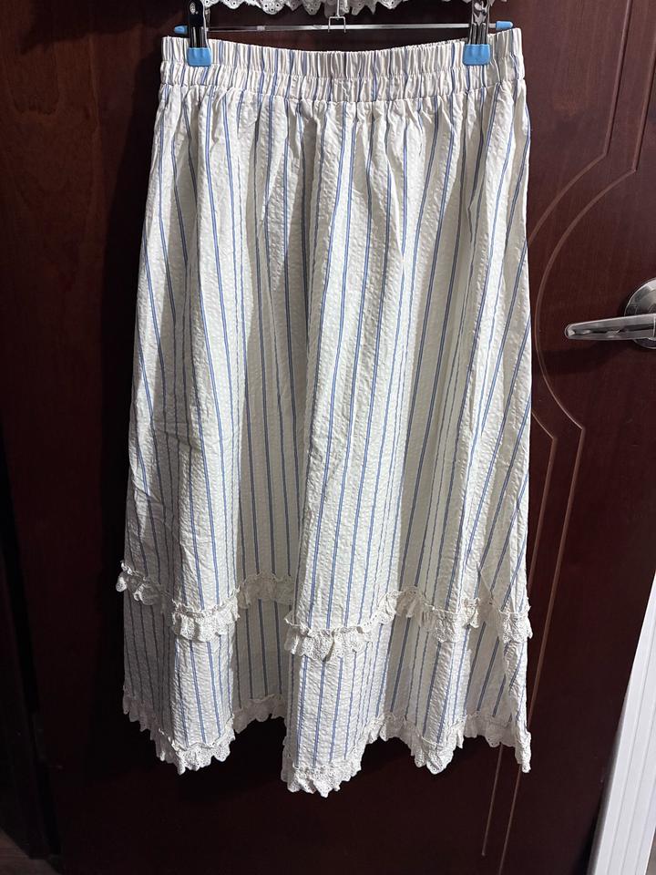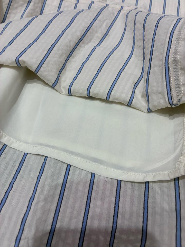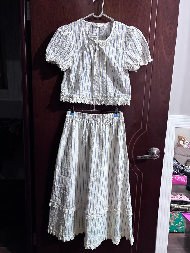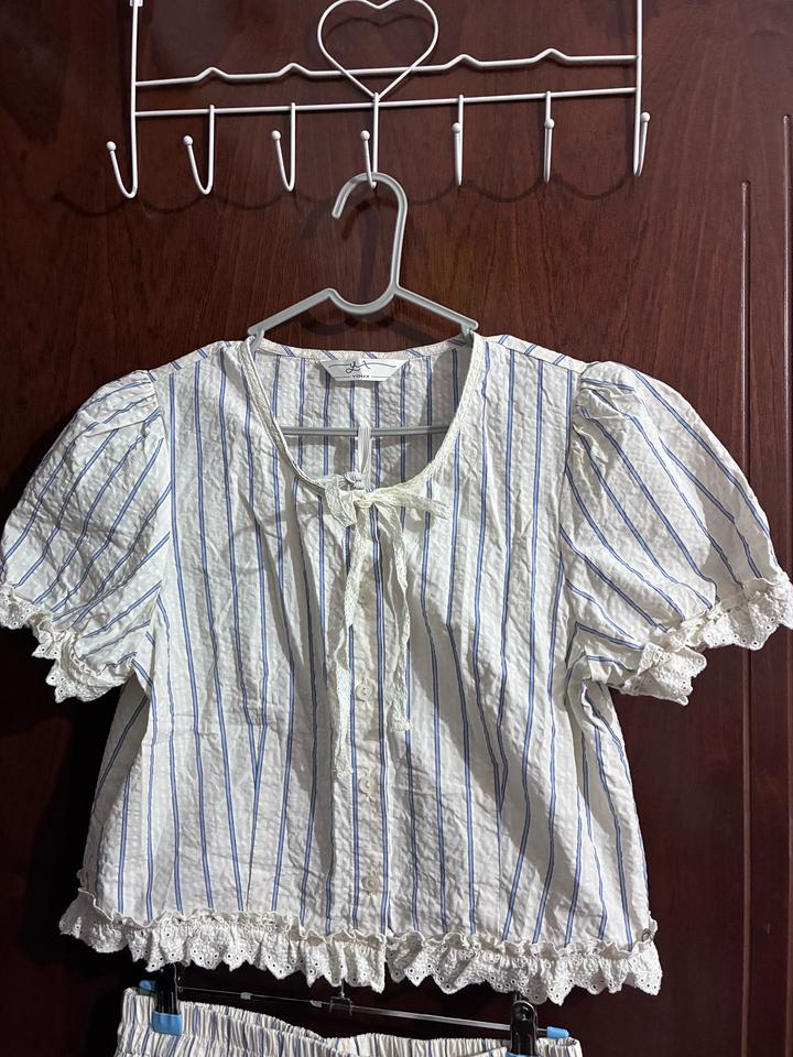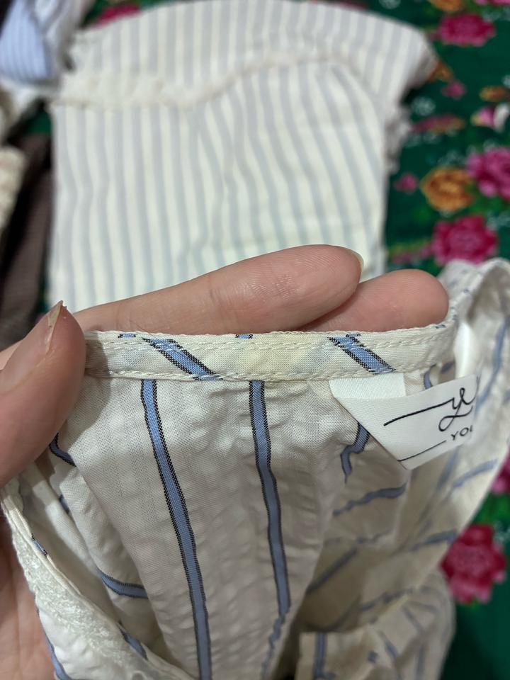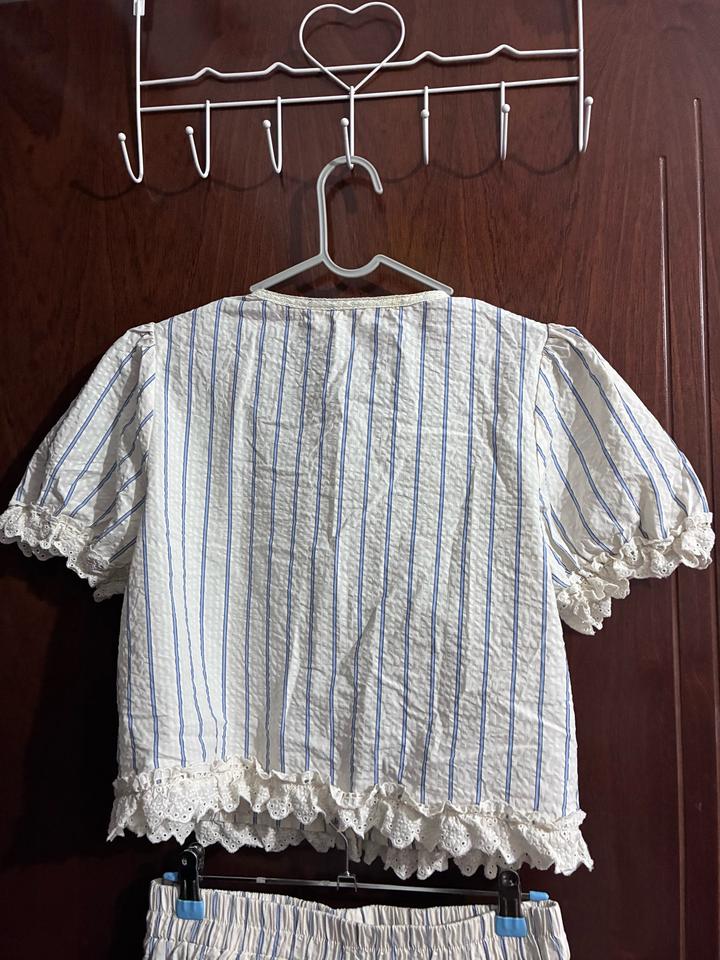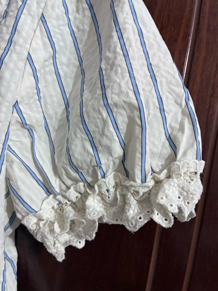 Двойка с рюшами, в синию и айвори полоску Рукава и пояс на резинке, кофта на пуговицах и ленте Есть маленькое пятно, но при носке не заметно (см. фото 7) Продаю т.к размер не подошел p.s. если у вас обхват груди выше 95см, вам блузка не подойдет Артикул: 436562