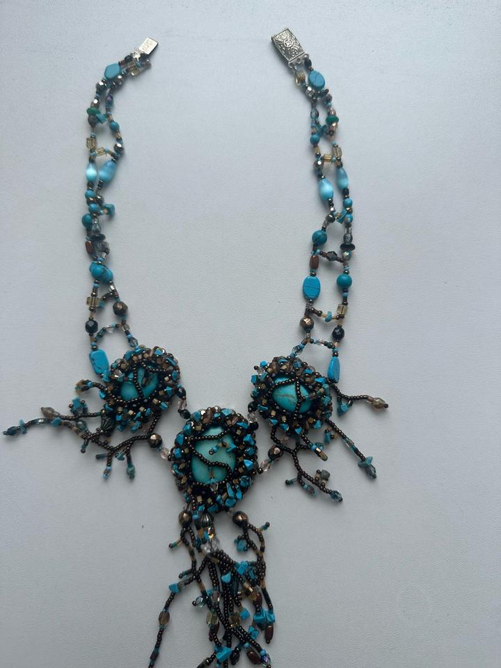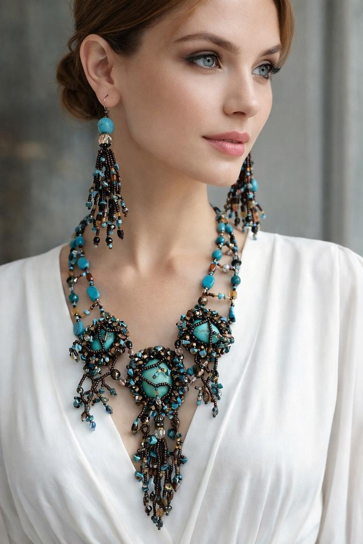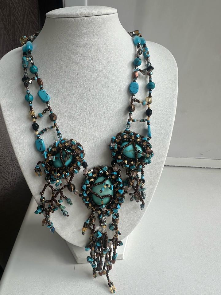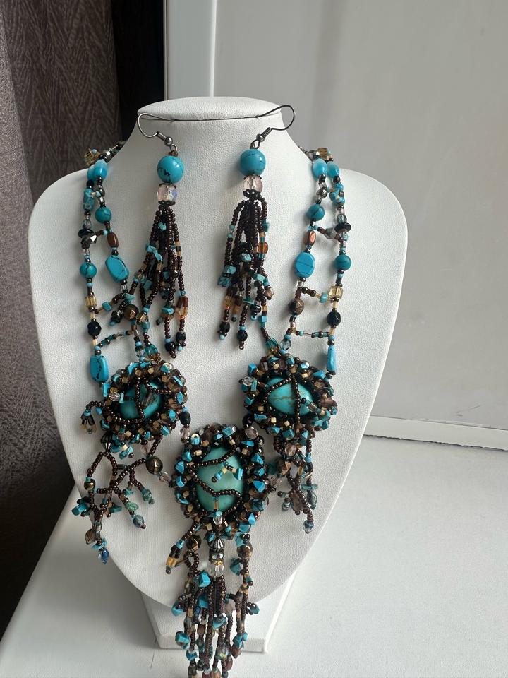 Украшение ручной работы, ожерелье и сережки из бисера и бирюзы. Ручная работа на заказ в одном экземпляре. Артикул: 437352
