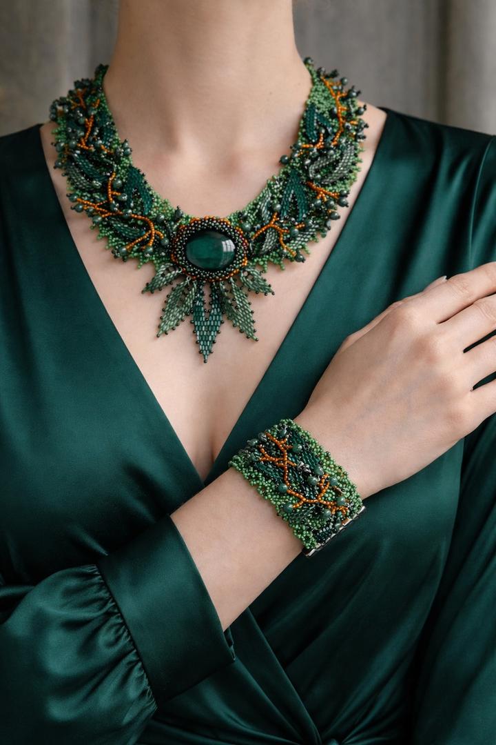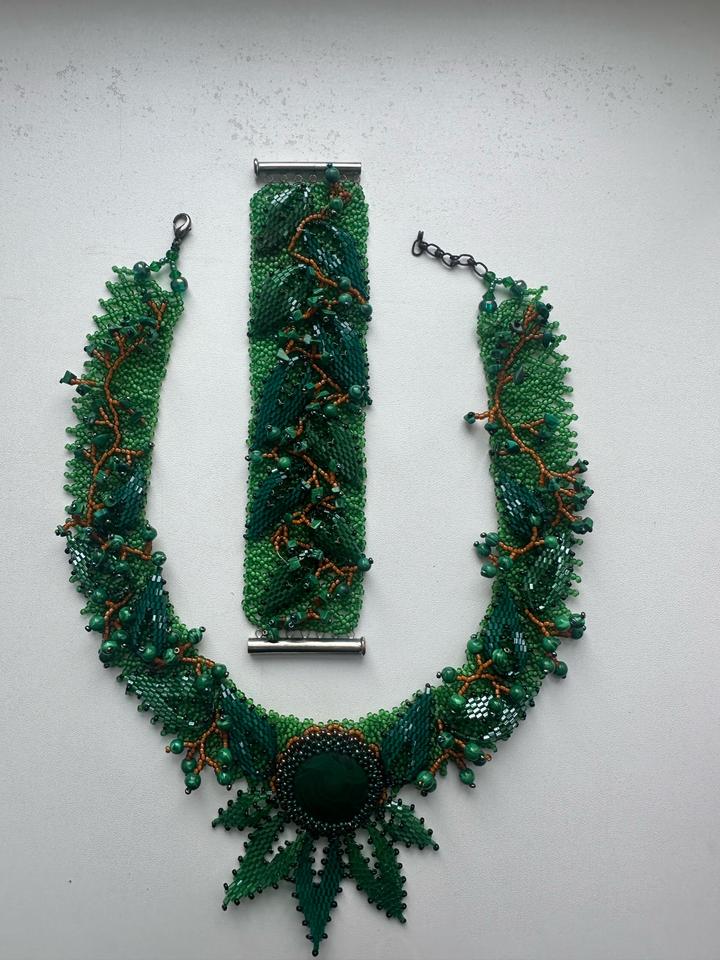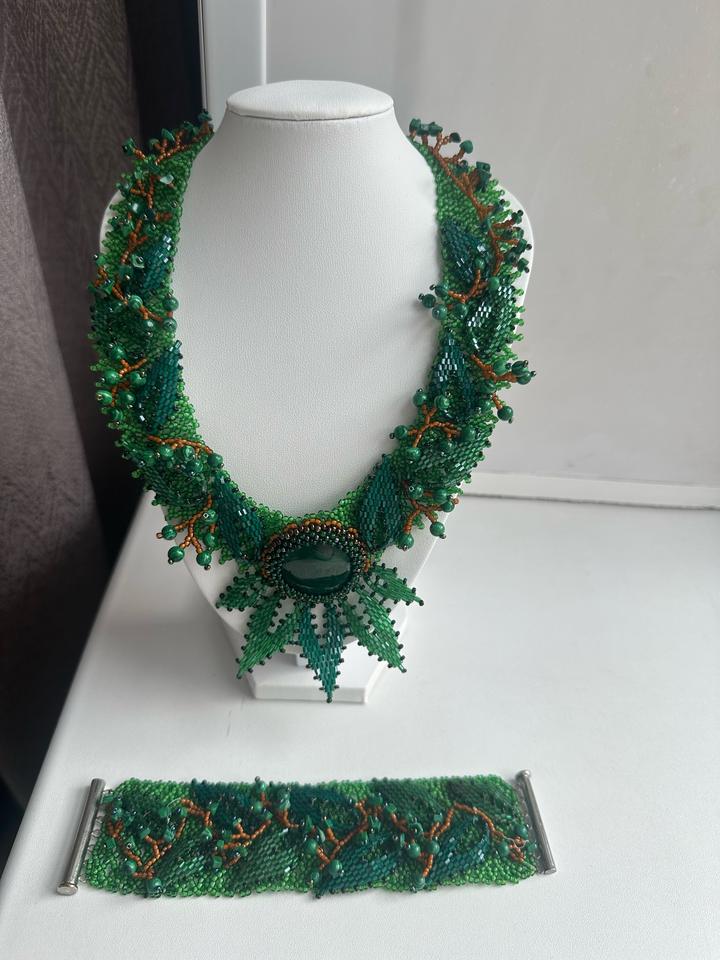 Украшения ручной работы. Ожерелье и браслет - плетение бисер и малахит. Набор сделали на заказ в одном экземпляре. Артикул: 437358