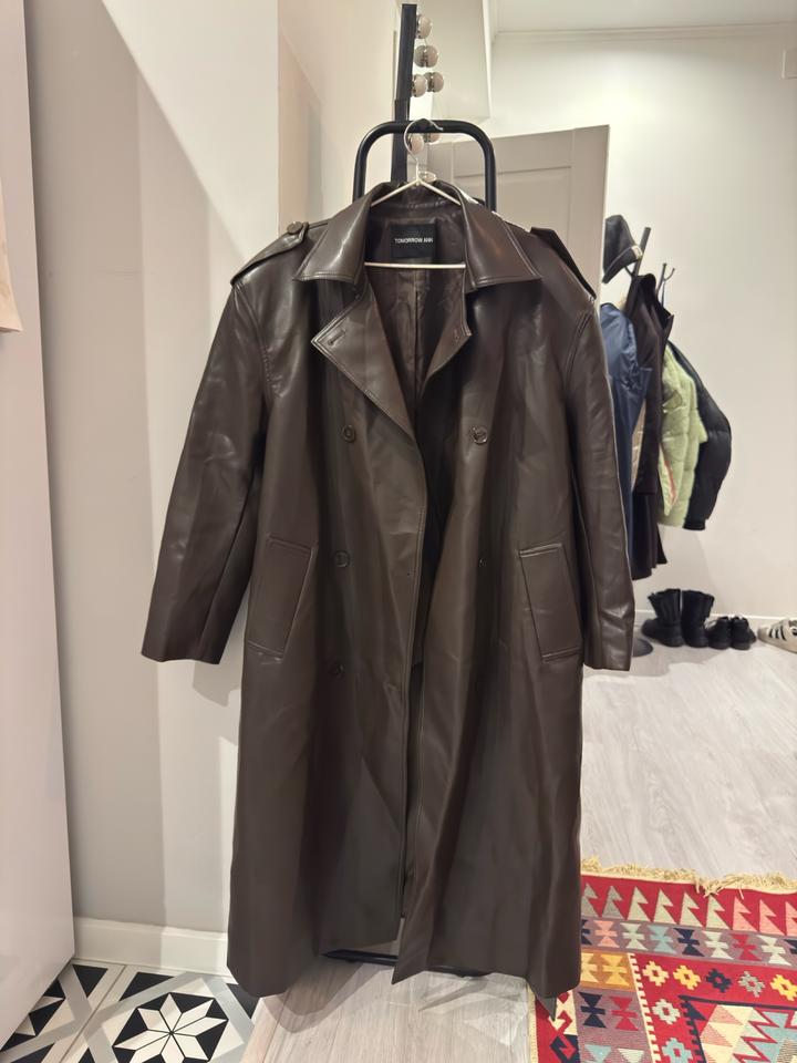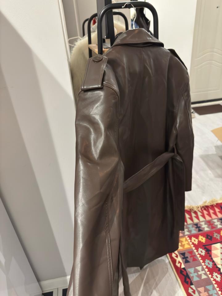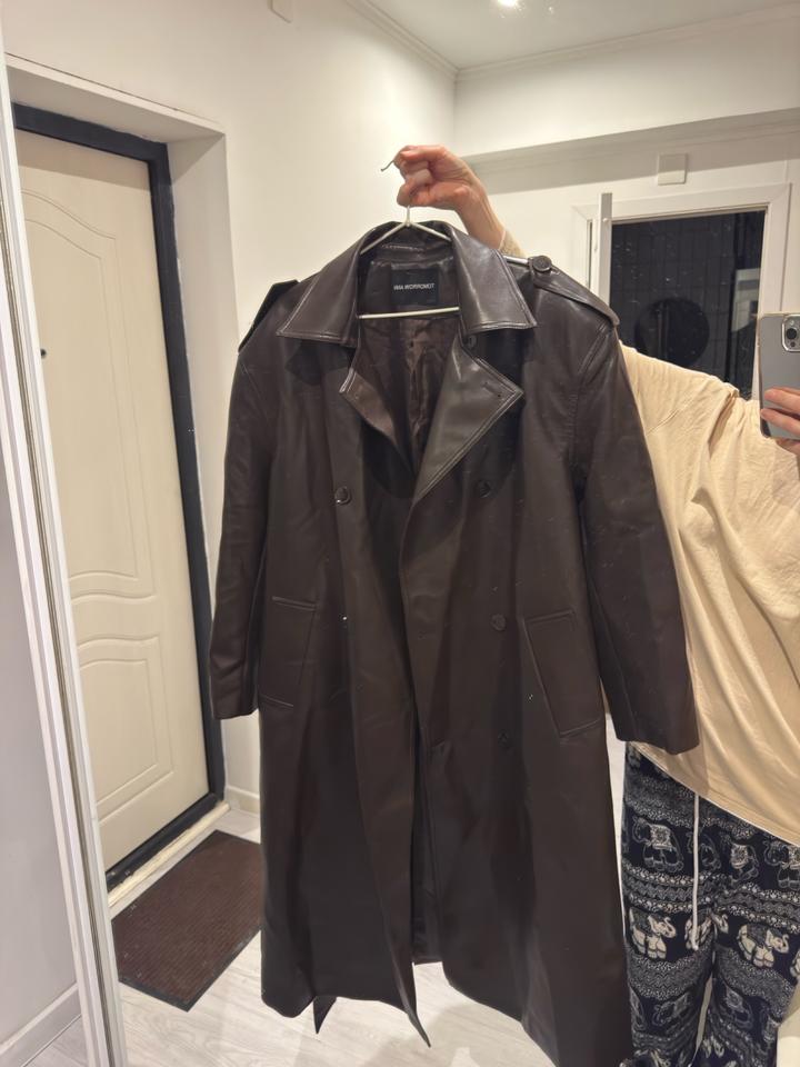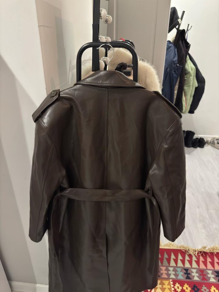 Тренч кожаный цвет шоколад оверсайз с утрированными плечамиS/M