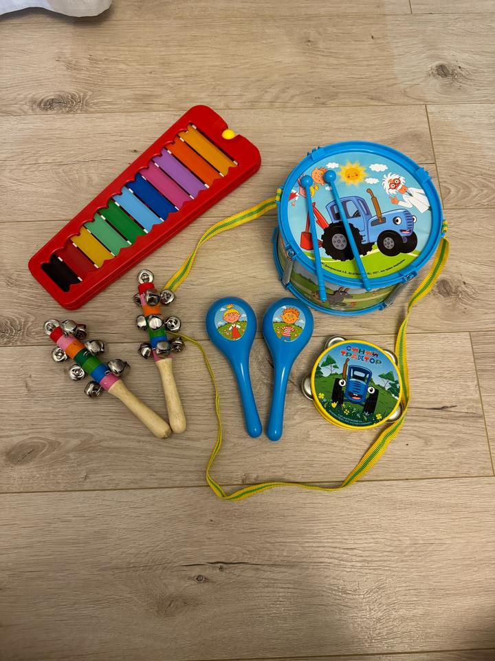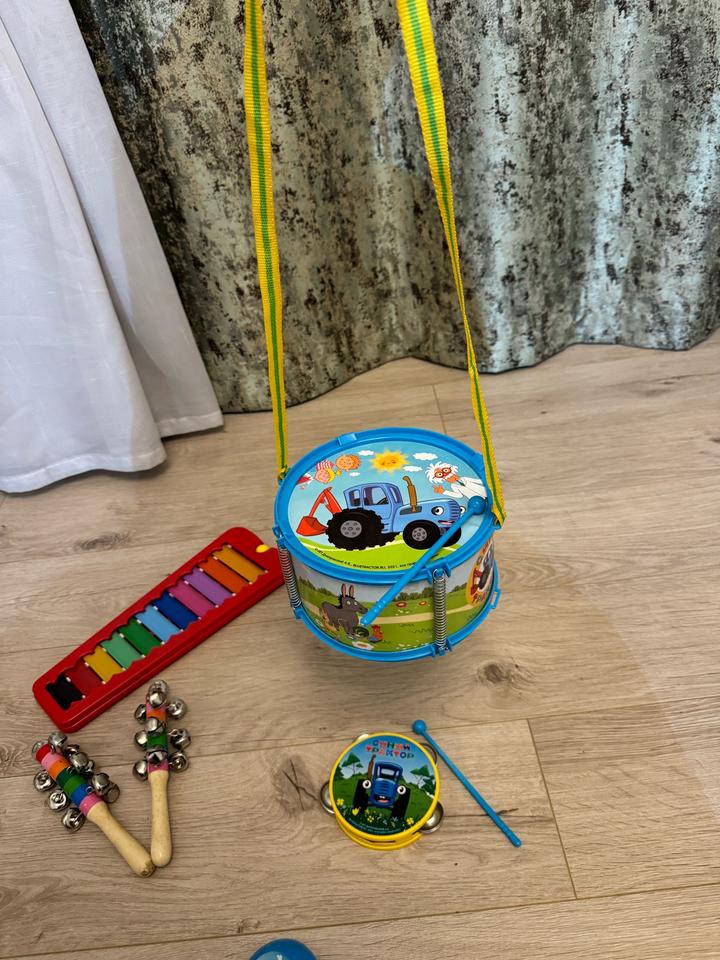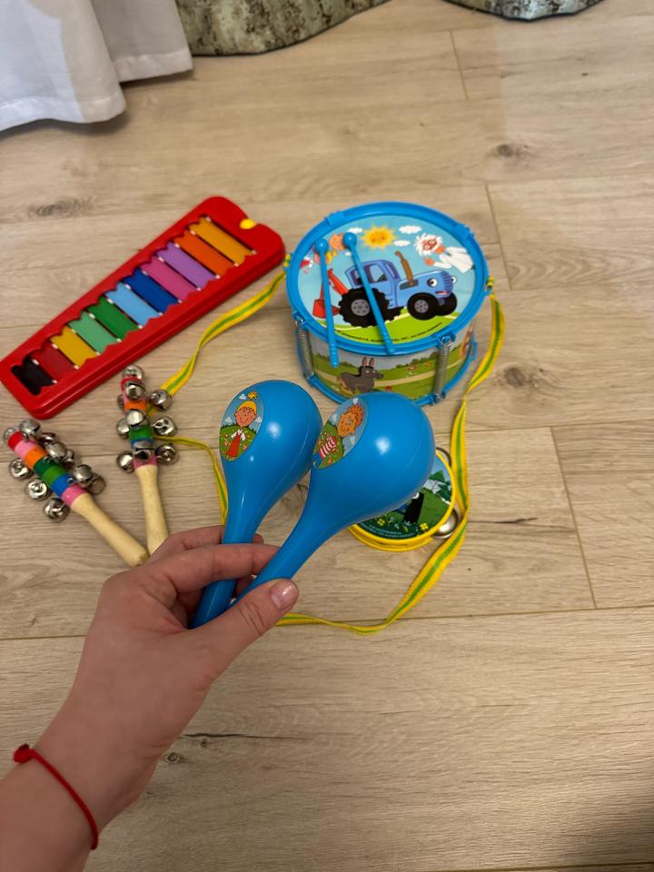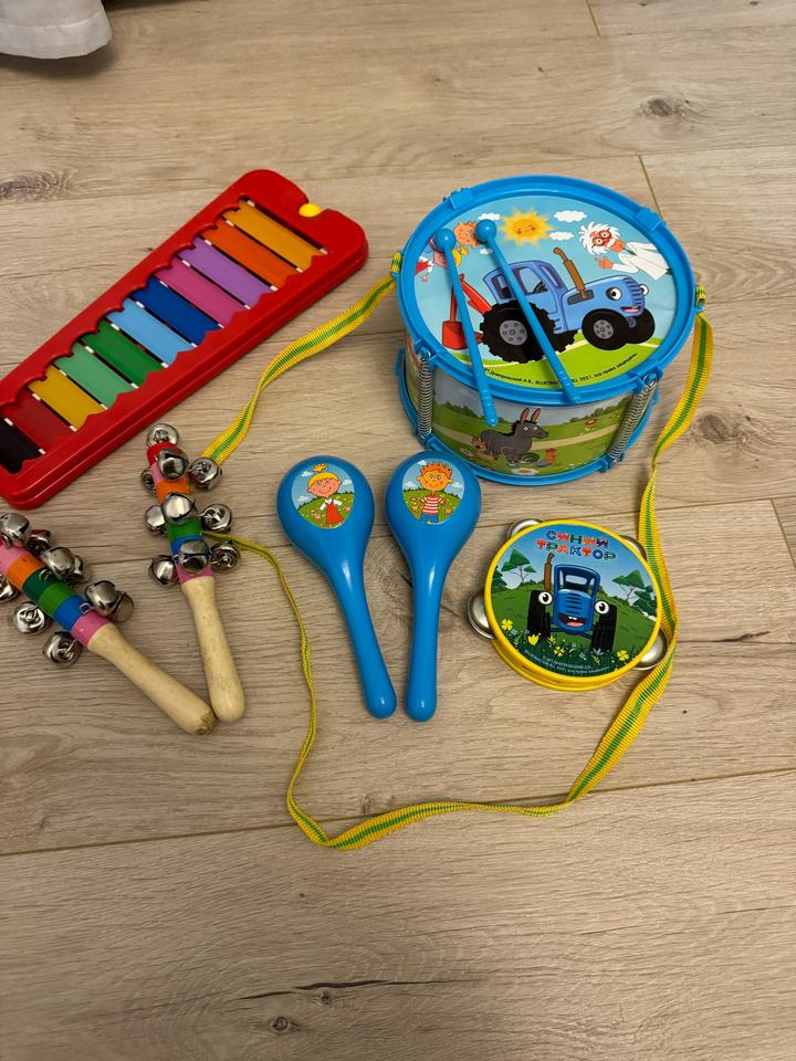 Игрушки : ксилофон, бубенцы, барабан, бубен, маракасы. Синий трактор Артикул: 437973