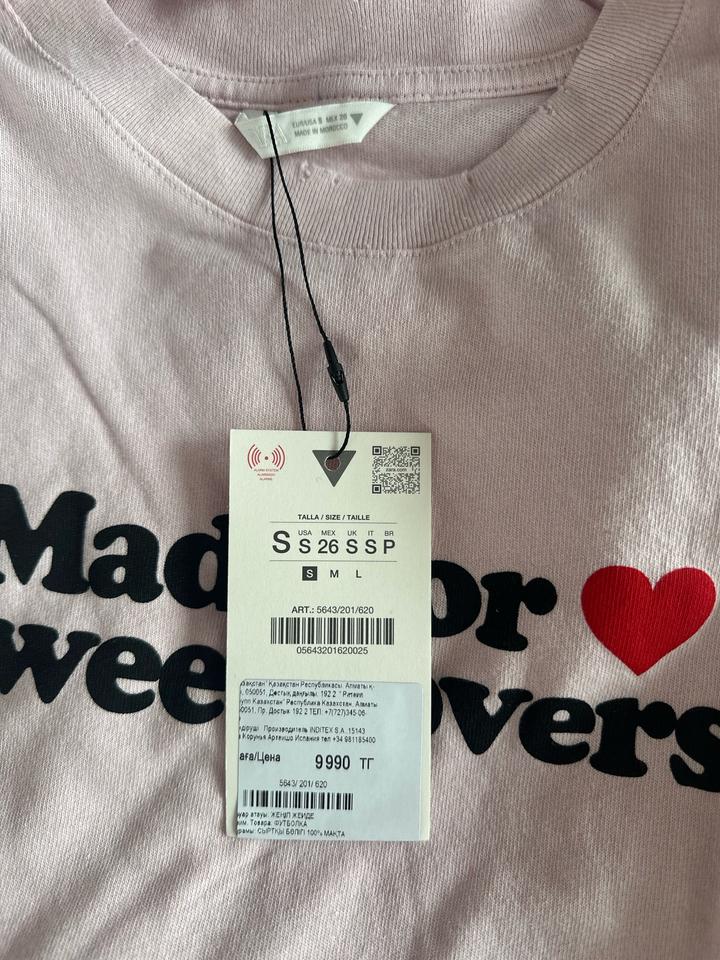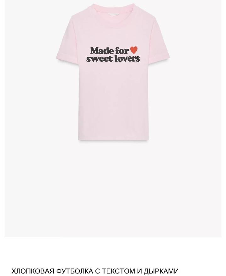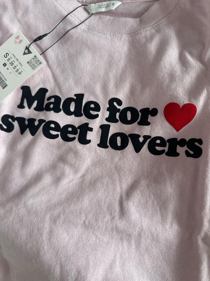 Нежно-розовая хлопковая футболка Zara с ироничным принтом 🤍 Мягкий хлопок, прямой крой и контрастный текст “Made for sweet lovers” с сердцем создают лёгкое, игривое настроение. Универсальная база для повседневных и Y2K-образов — отлично сочетается с джинсами, мини-юбками и кардиганами. Смотрится свежо и стильно. Артикул: 438645