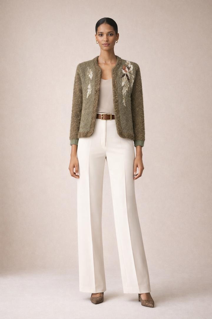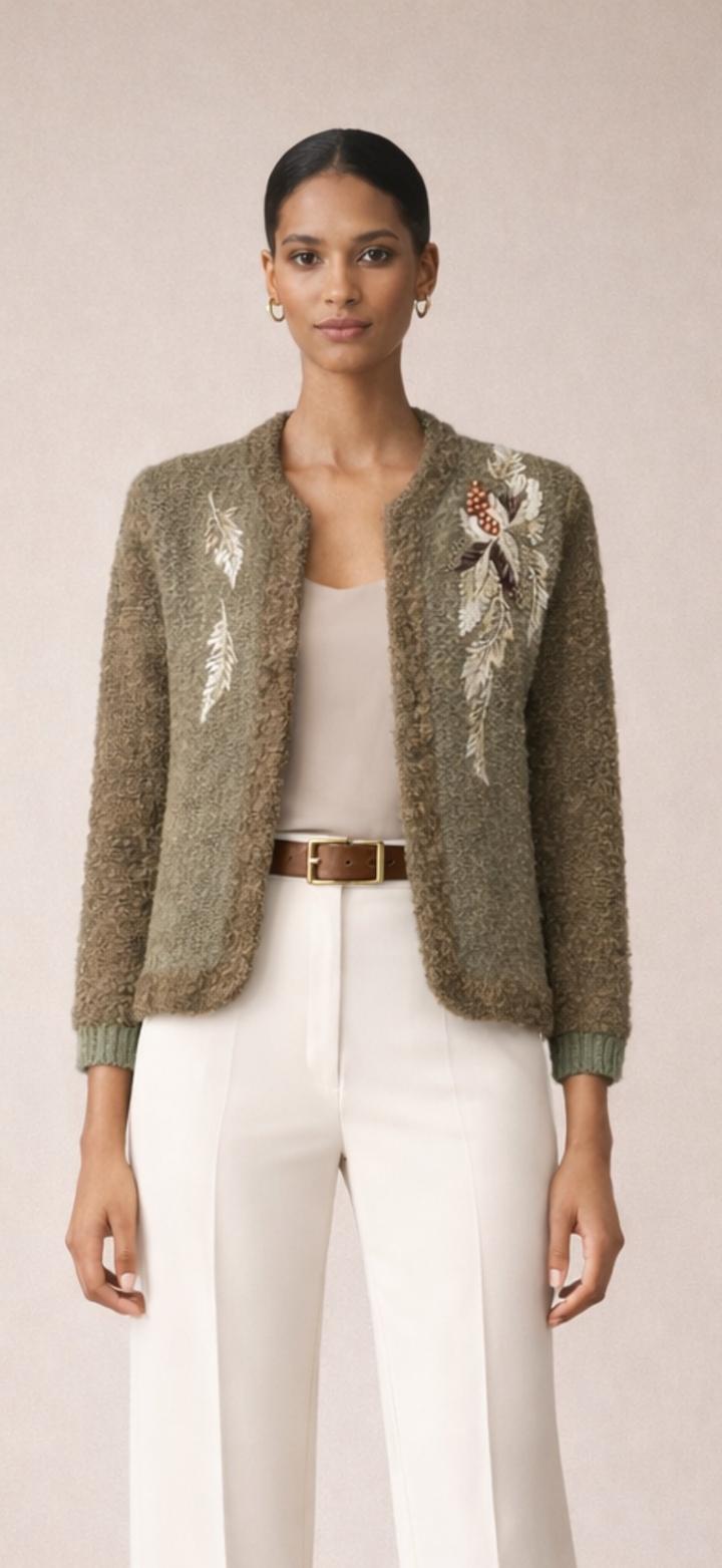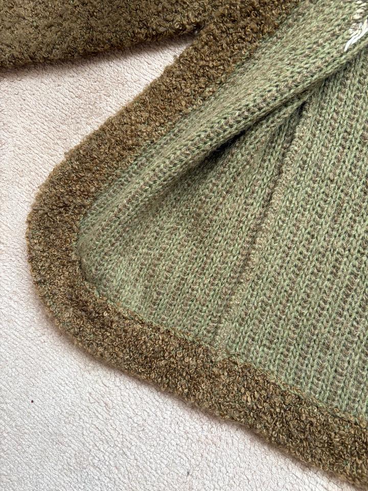 Кардиган в оливковой гамме выполнен из фактурного, мягкого трикотажа с эффектом букле, который придаёт. Модель прямого силуэта с длиной 65 см от ворота, длина рукава 57 см.По линии обхвата груди 52см. Артикул: 440319