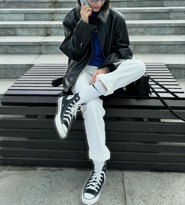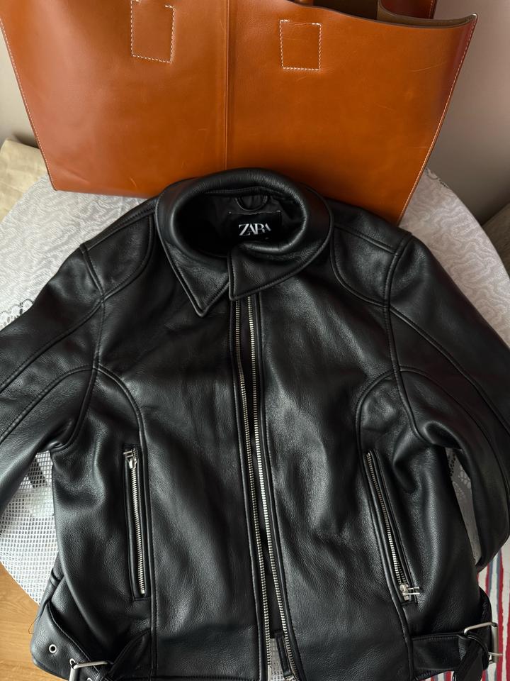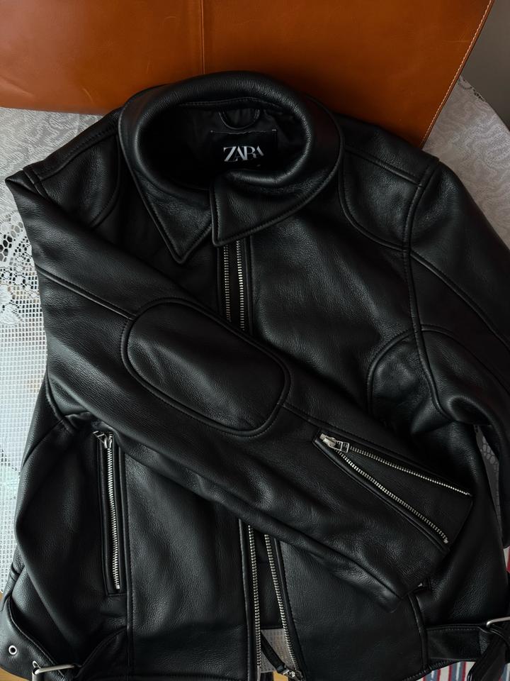 Куртка из искусственной кожи в отличном состоянии. Выполнена качественно, есть слегка утепленный подклад, отлично подойдет на раннюю весну, позднюю осень. Размер М, мой размер XС, сидит оверсайз. Носила буквально два-три раза. Ворот можно поднять, можно отпустить. Артикул: 440475