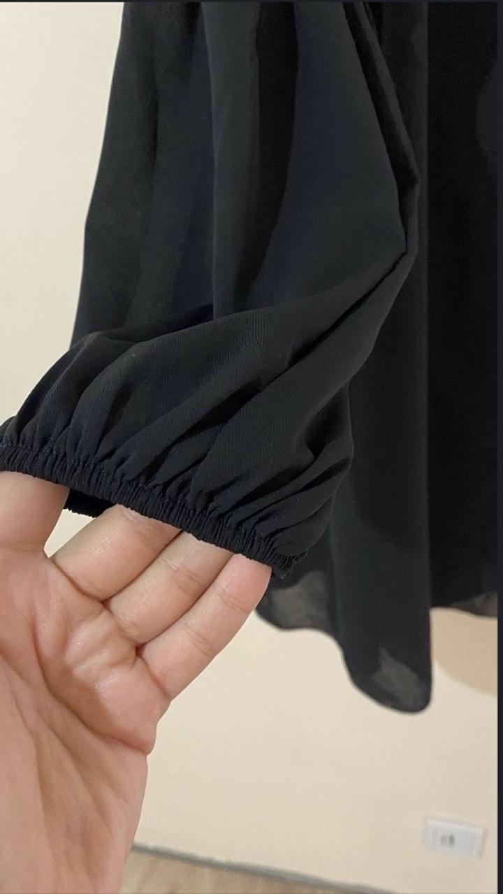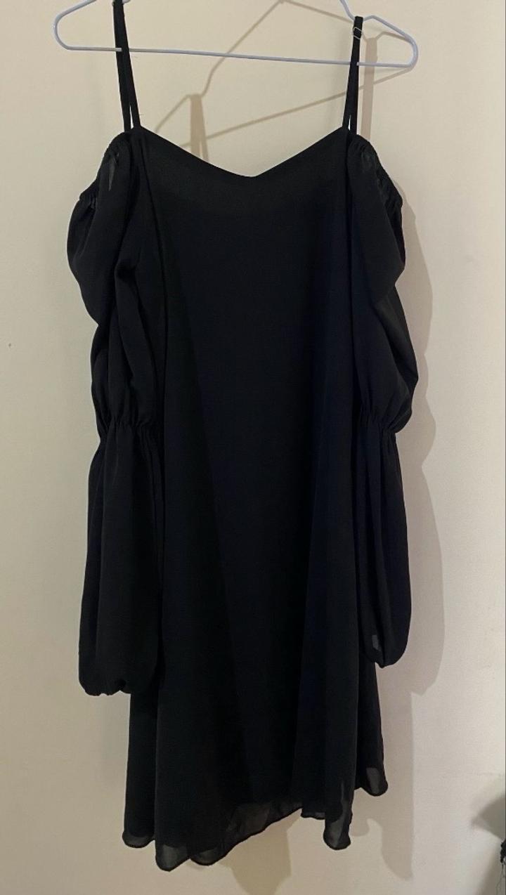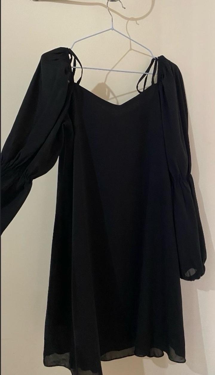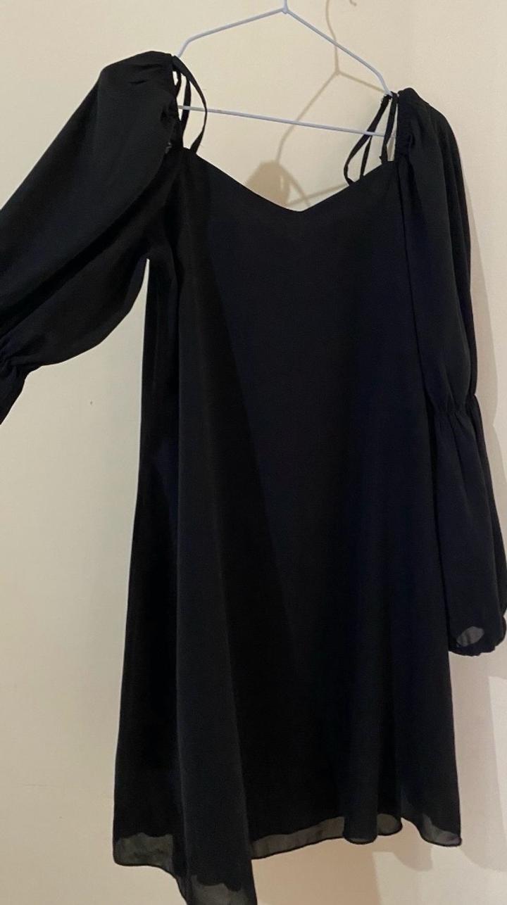 Лёгкое чёрное платье, свободного кроя. Размер S. С длинными рукавами и открытыми плечами на завязках. Ткань лёгкая, струящаяся. Состояние отличное. Артикул: 440748