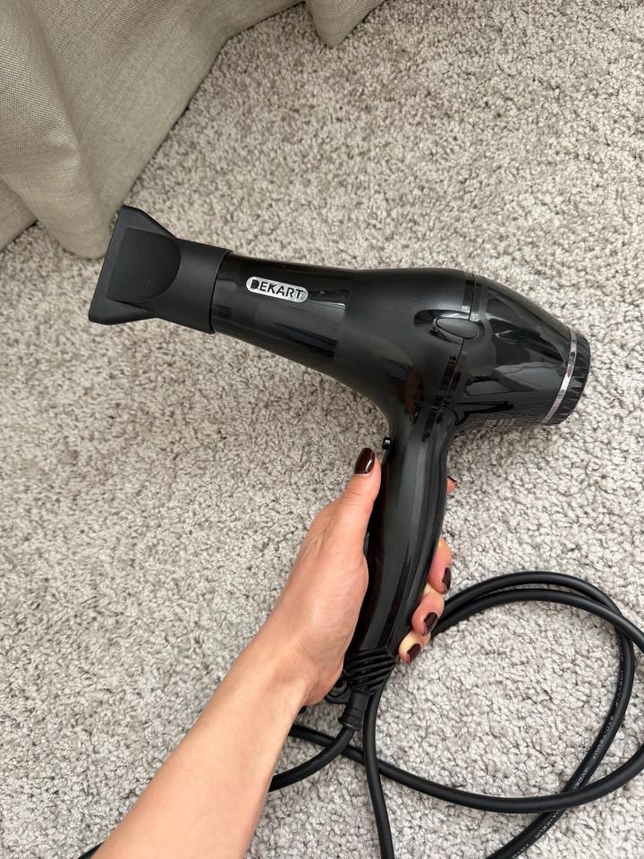 Фен, укомплектованный расческой-термобрашингом, двумя бигуди-зажимами и двумя нассадками. Использовала всего 2 раза. Муж подарил Дайсон, он больше не пригодился. Артикул: 441621
