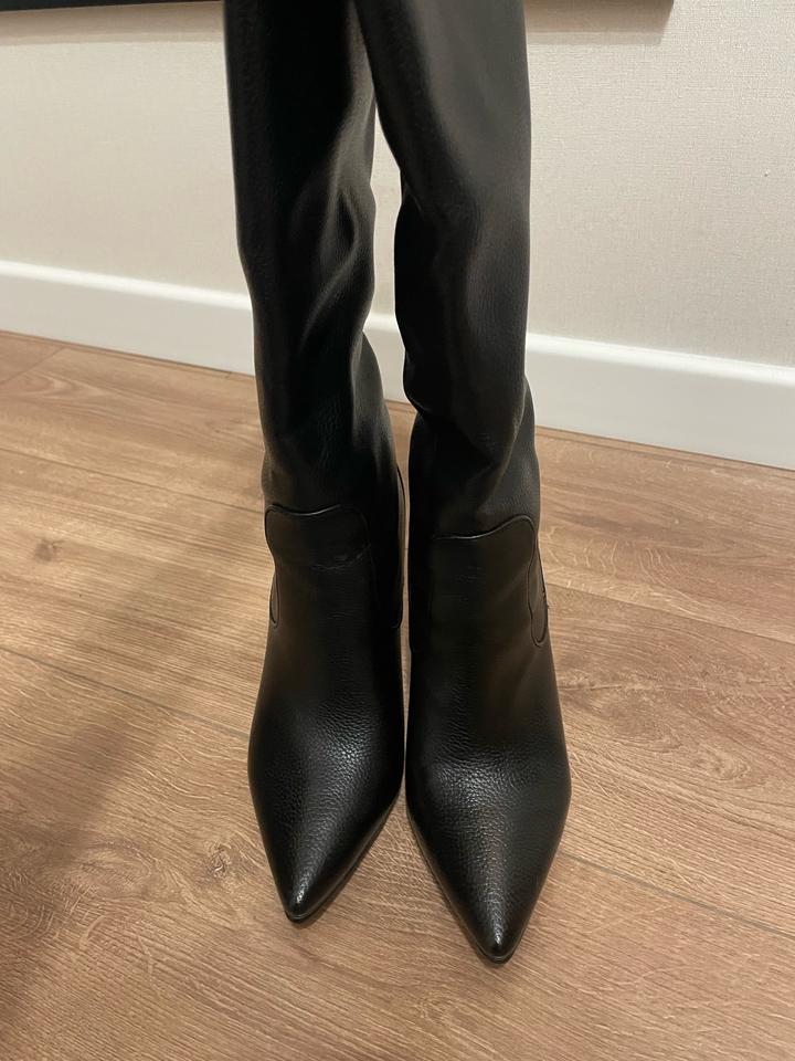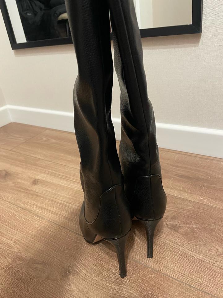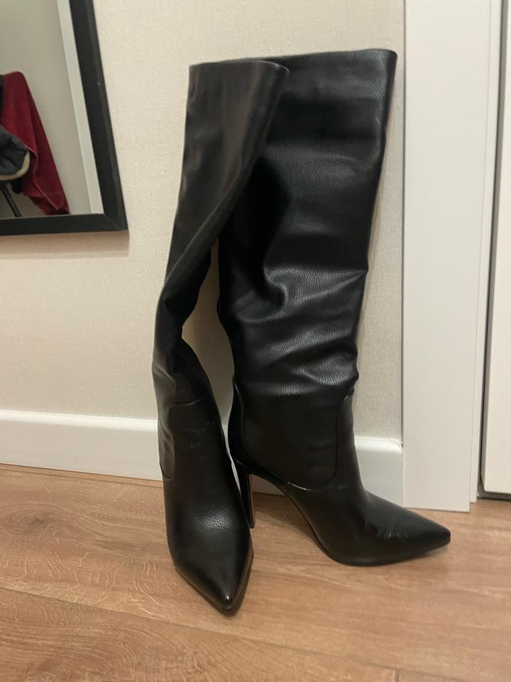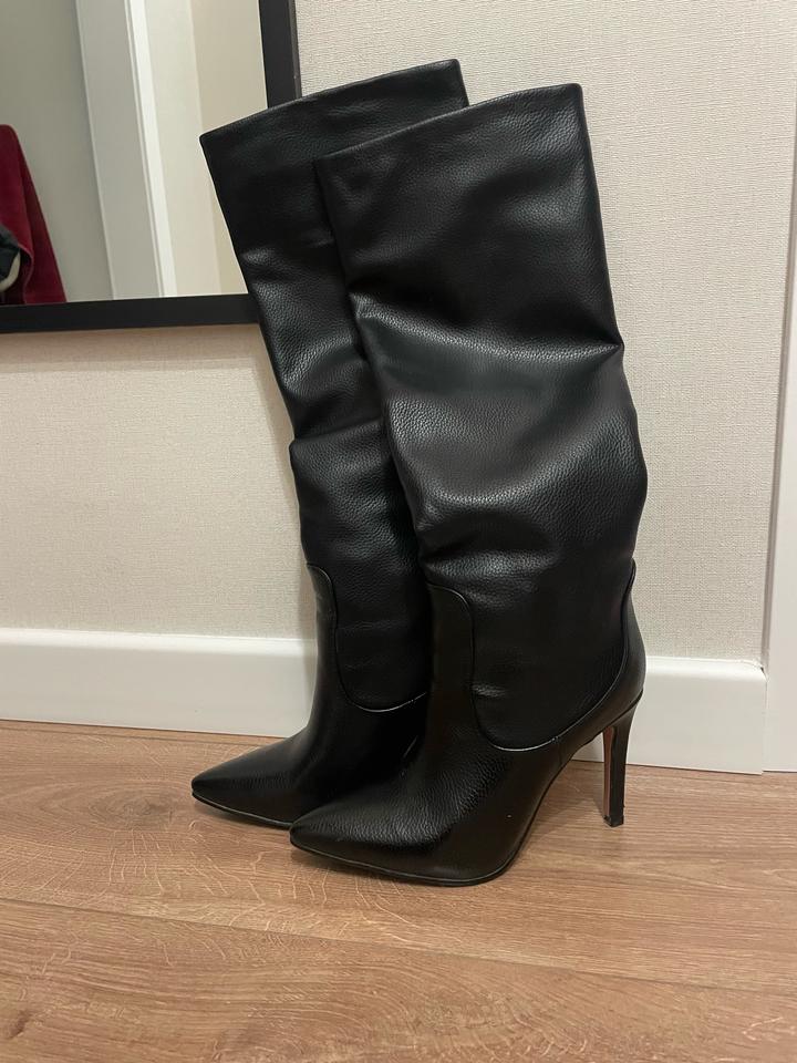 Черные сапоги без замка, трубы. На узкие икры, но можно также Голенище собирать в складку. Одевала 1 раз, но есть небольшие царапины (они не заметны, если не приглядываться) . Сапоги Отлично подойдут для наряда на мероприятие. Очень удобные не смотря на каблук. Артикул: 441807