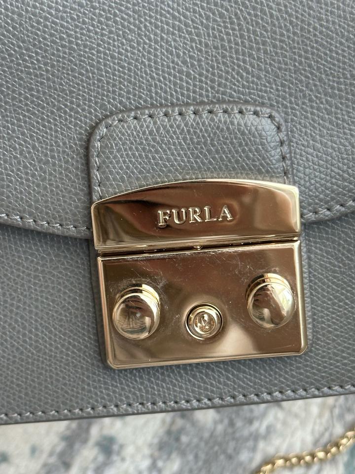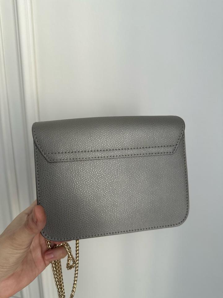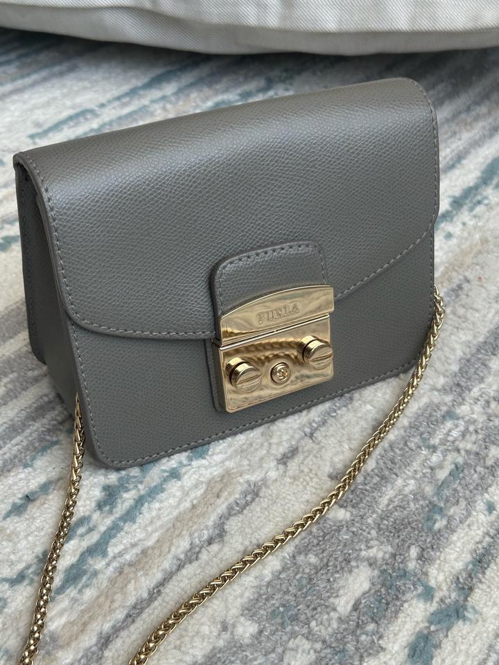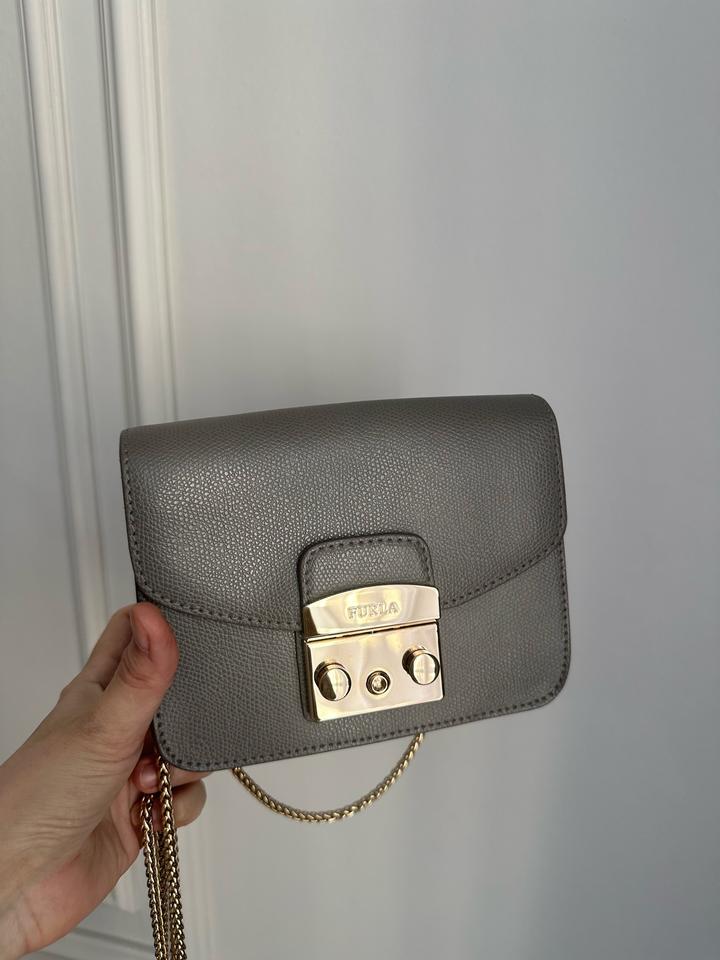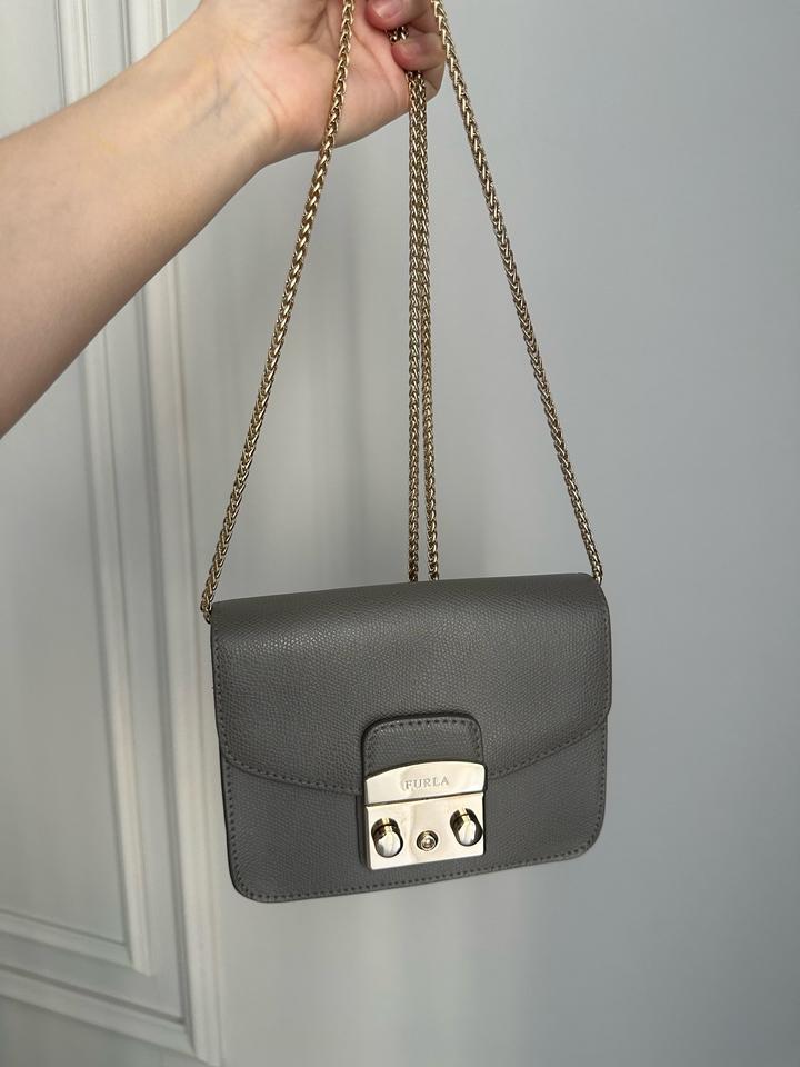 Небольшая сумка Furla, оригинал. В отличном состоянии. Светло серый цвет. На цепочке. Царапины отсутствуют, на золотистой застежке есть немного следы от открывания. Носила крайне редко (только на мероприятия). Размеры: ширина 16,5 см, высота 13 см, глубина 7,5 см Артикул: 443924
