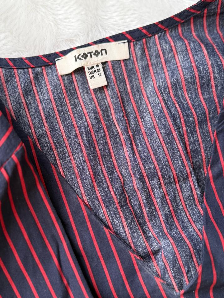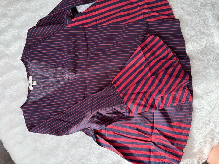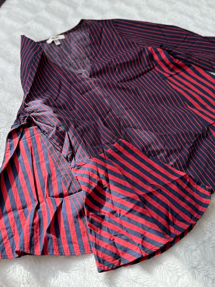 Блуза в красно-синюю полоску с красивыми расклешенными рукавами, с V-образным вырезом, одевалась один раз, состояние нового, как на фото, размер 42-44-46 можно Артикул: 444609