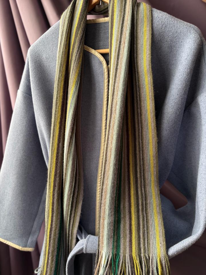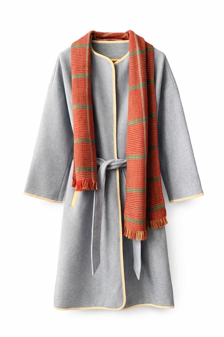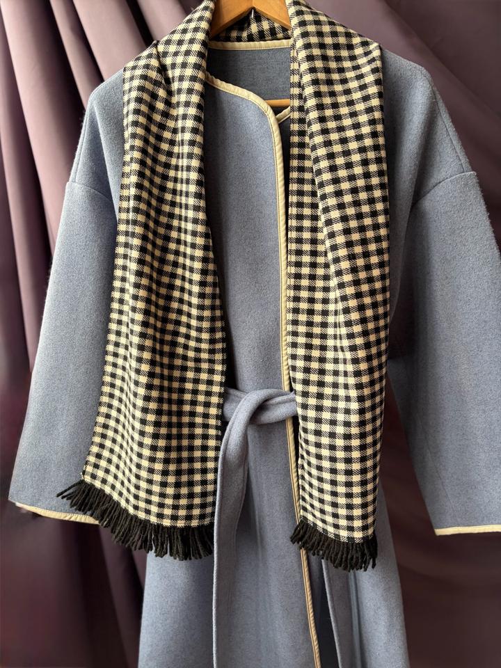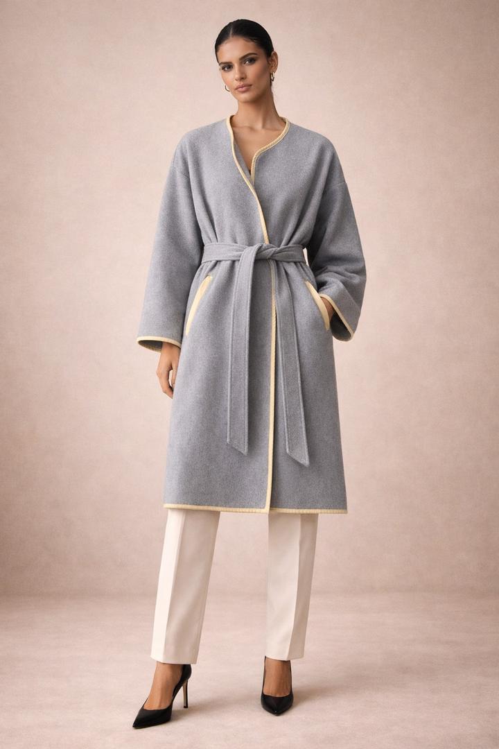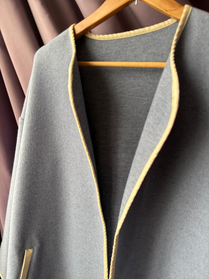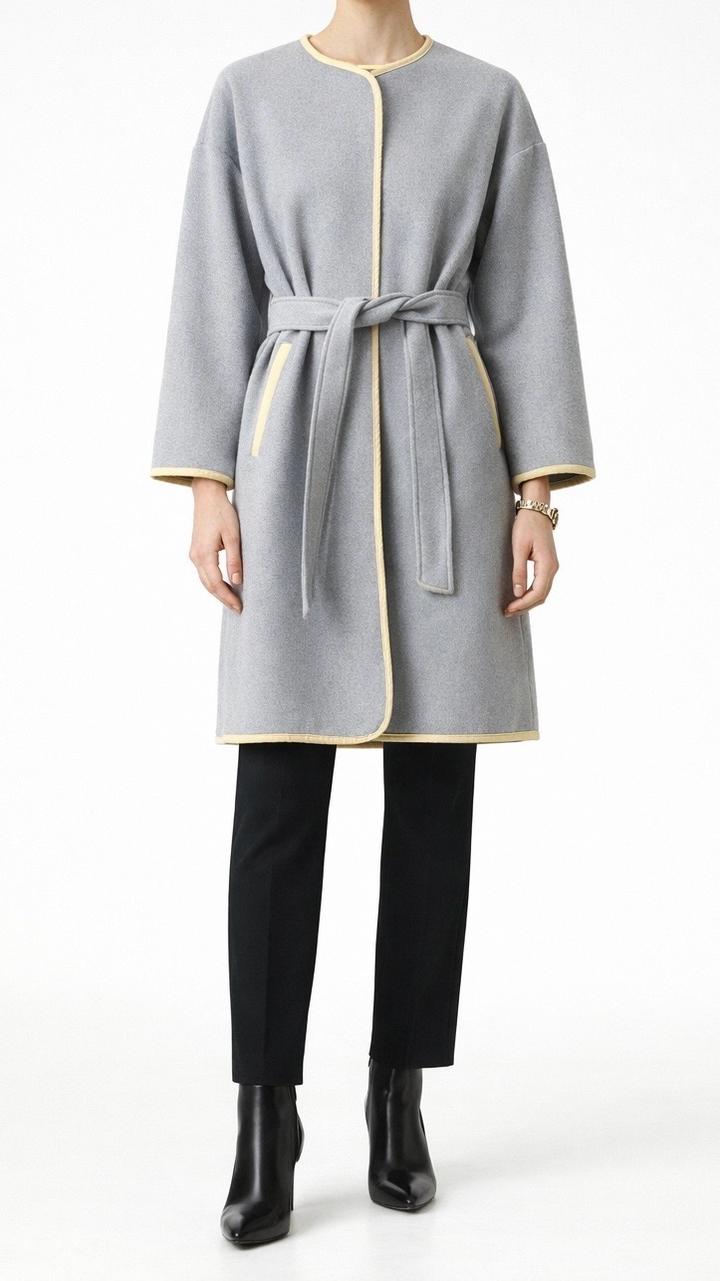 Новое пальто с окантовкой из искусственной кожи молочного цвета. Состав: полиэстер - пятьдесят три процента, район - сорок семь процентов. Длина пальто сто четырнадцать сантиментов. Артикул: 444708