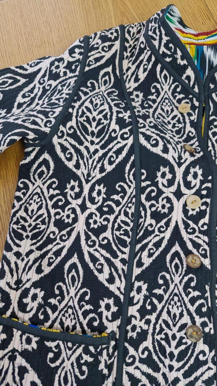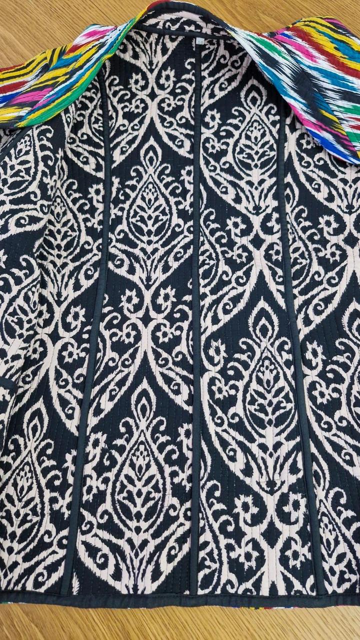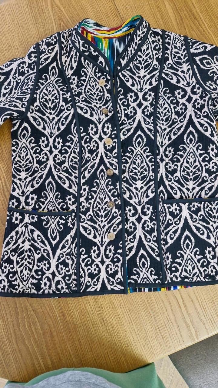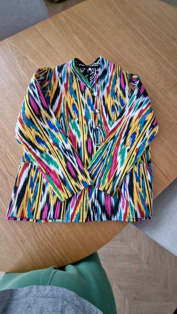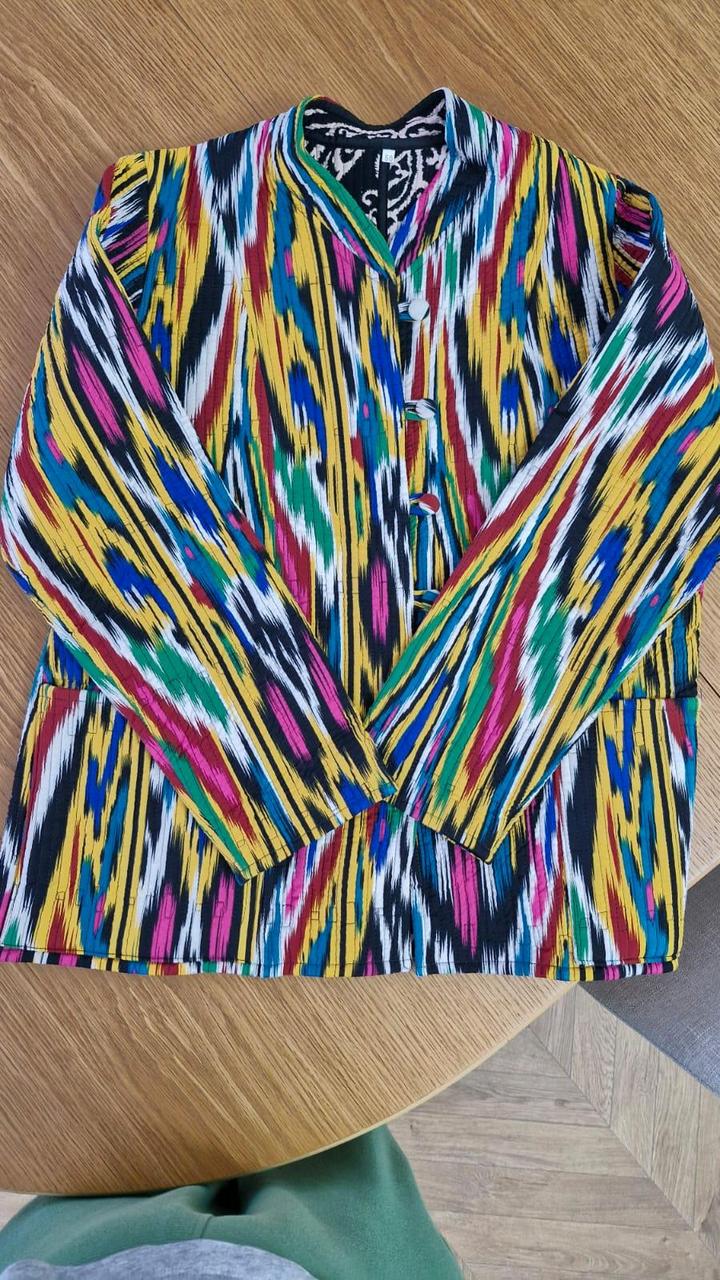 Очень красивая двухсторонняя куртка из шелка адрас. Ткань ручная, 50% волокон шелка и 50% волокон хлопка. На теплую весну. Из-за натуральности ткани достаточно теплая. Очень тактильно приятная. Не рыхлая как хлопковые. Не сравнима с вариантом из Киргизии. Артикул: 445013