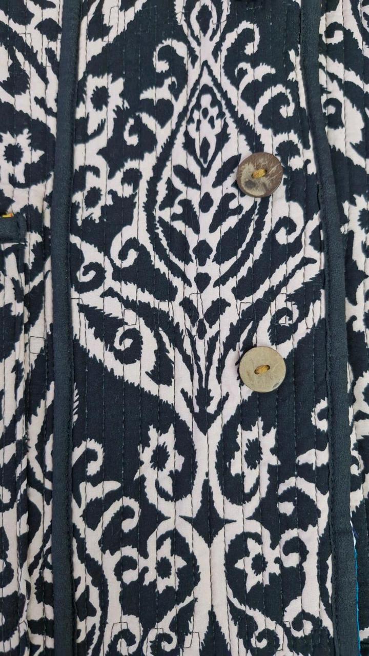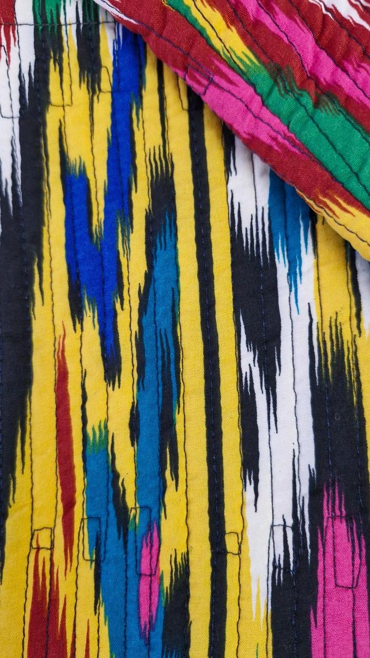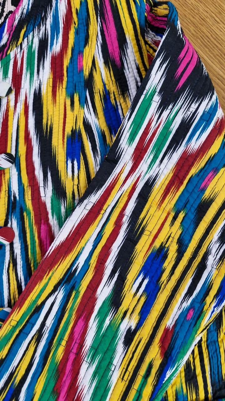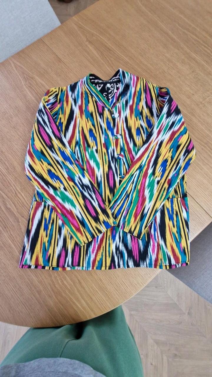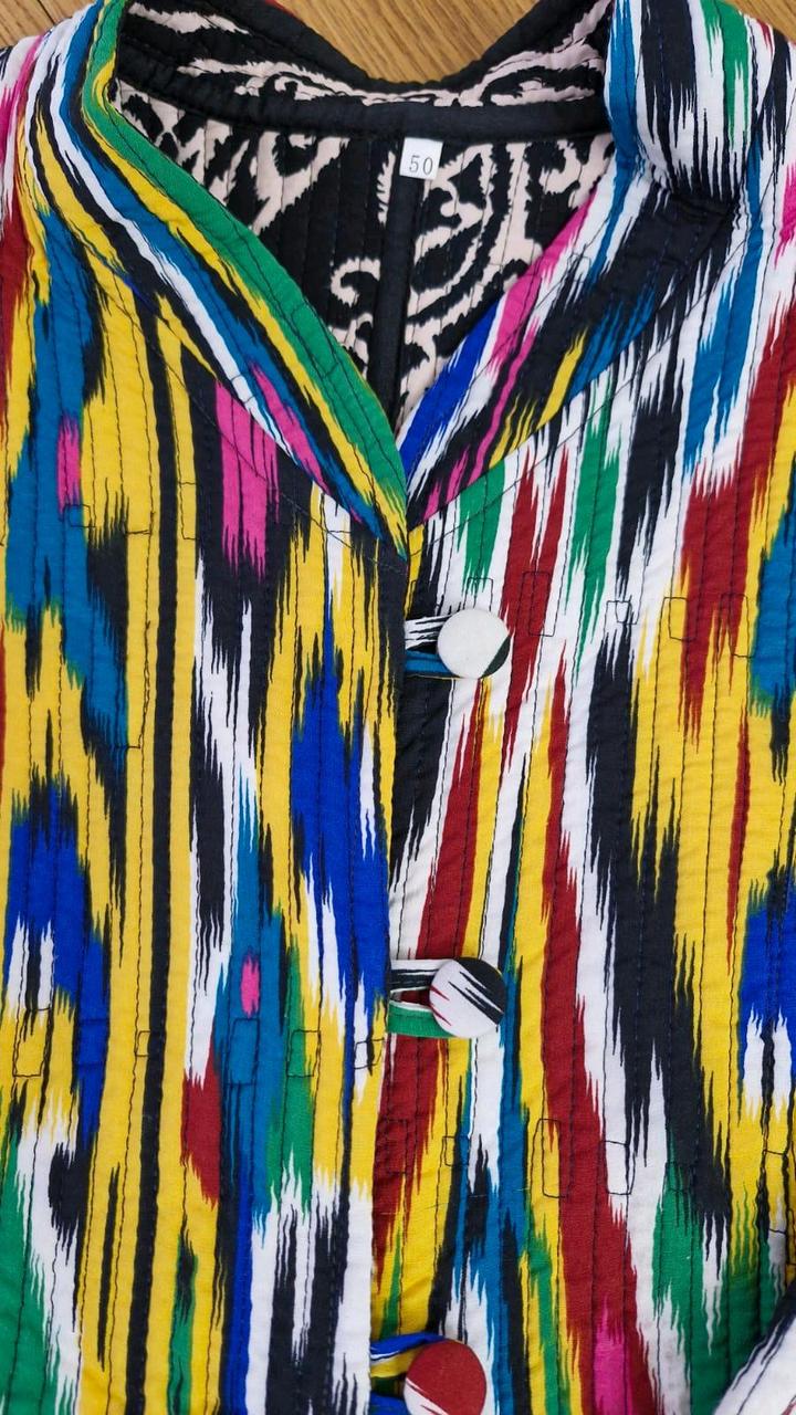 Очень красивая двухсторонняя куртка из шелка адрас. Ткань ручная, 50% волокон шелка и 50% волокон хлопка. На теплую весну. Из-за натуральности ткани достаточно теплая. Очень тактильно приятная. Не рыхлая как хлопковые. Не сравнима с вариантом из Киргизии. Артикул: 445013