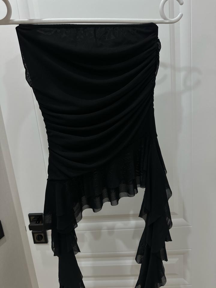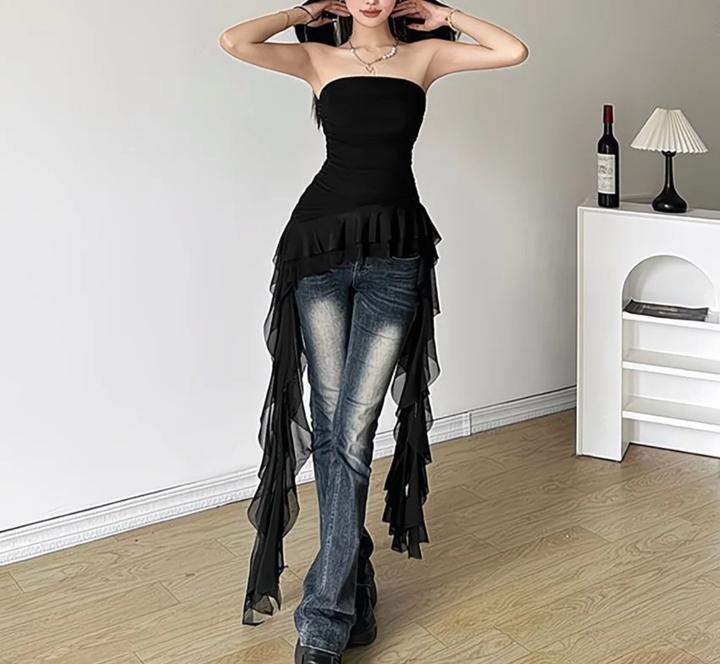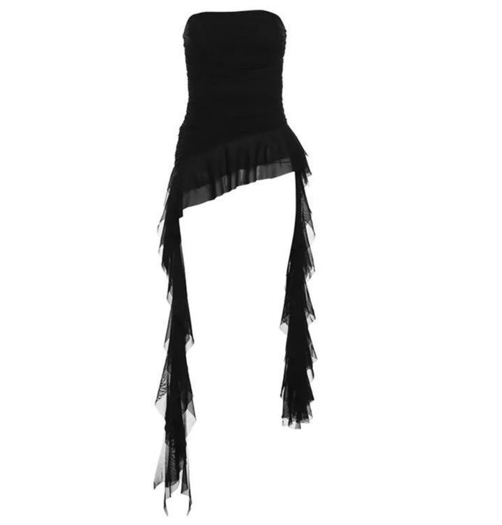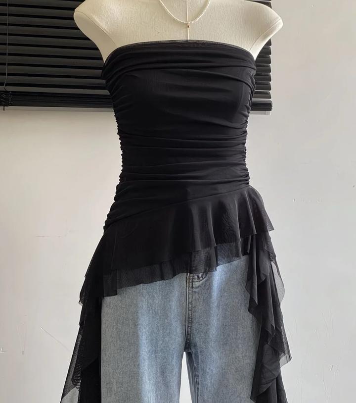 Чёрный асимметричный топ-бандо с каскадными шифоновыми воланами. Лёгкий, дерзкий и эффектный — для смелого вечернего образа. Артикул: 446089