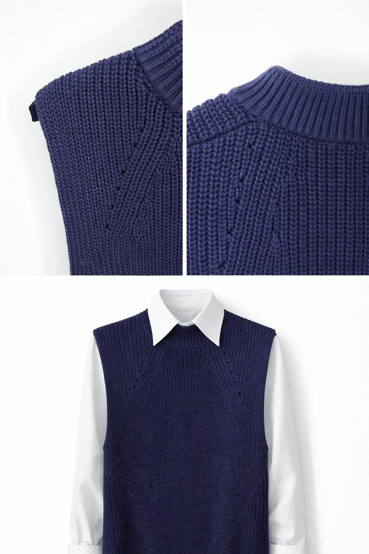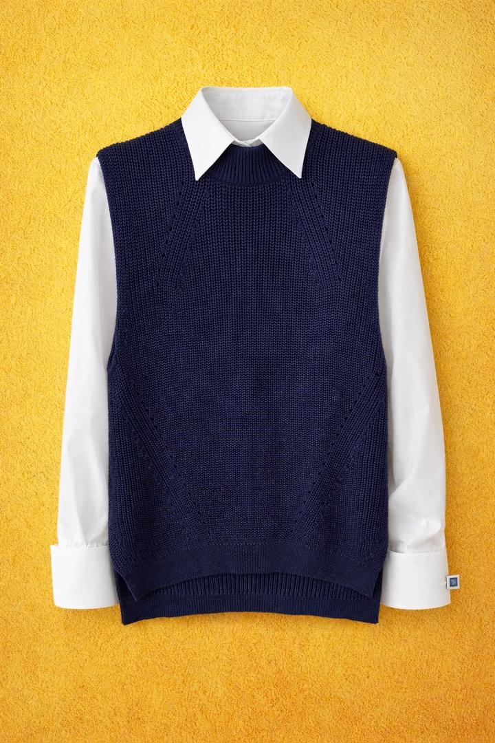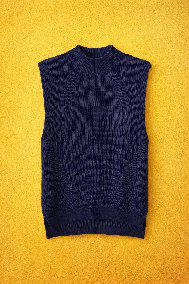 Жилет вязаный Цвет: темно синий Состояние новой вещи. Маркировка L, пойдет на M/L. Можно носить как самостоятельно так и комбинируя с другим предметом гардероба (топ, водолазка, рубашка) Артикул: 446391