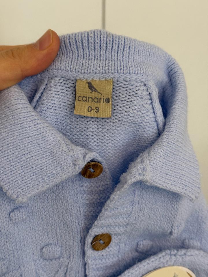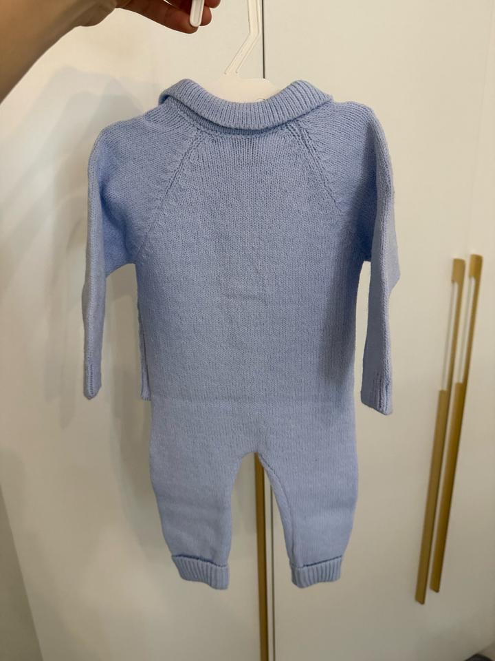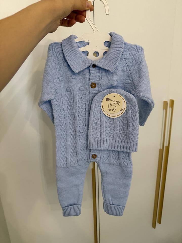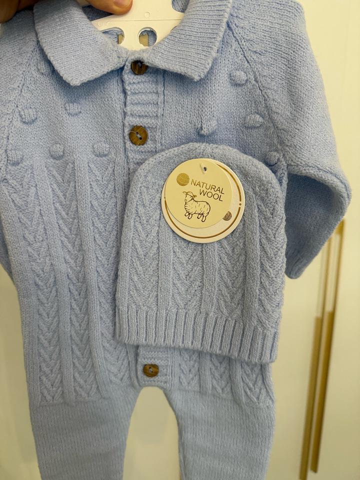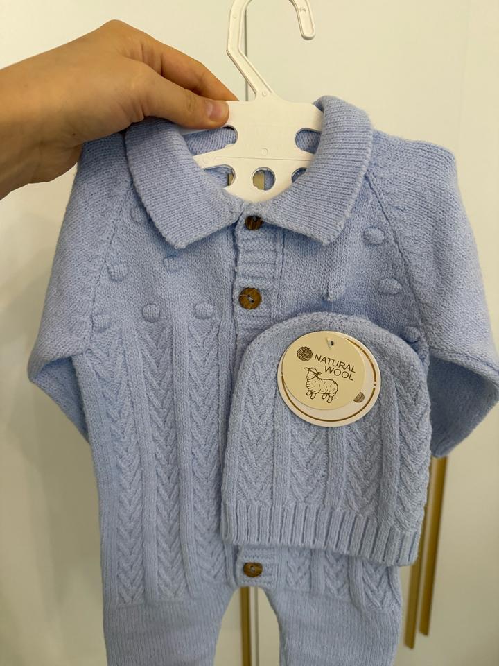 Вязанный костюм с шапкой Размер: 0-3 месяцев Цвет: Голубой Состояние: абсолютно новый, с биркой, ни разу не носился • Теплый и приятный к телу материал • Удобные пуговицы • Идеально для повседневной носки или на выписку. Артикул: 446556