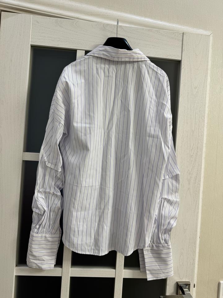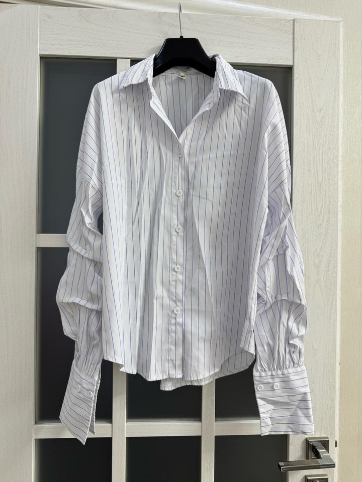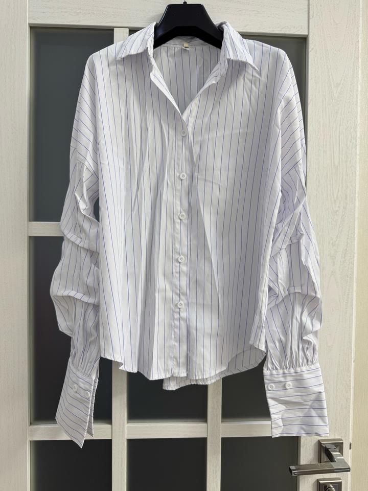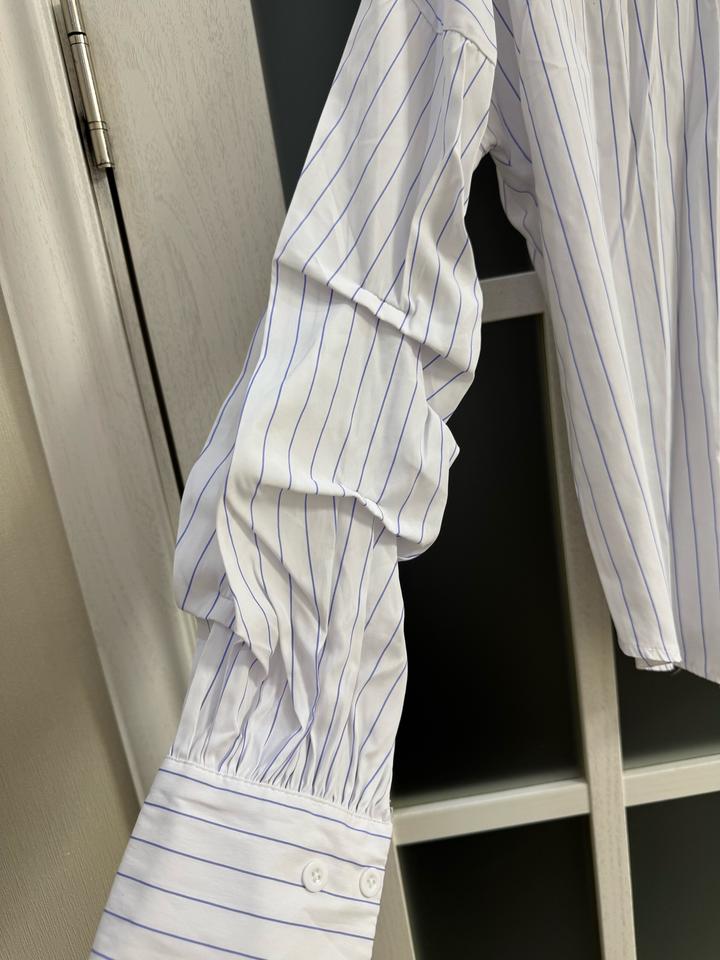 Белая женская рубашка в вертикальную синюю полоску с длинными рукавами и воланами. Артикул: 446894
