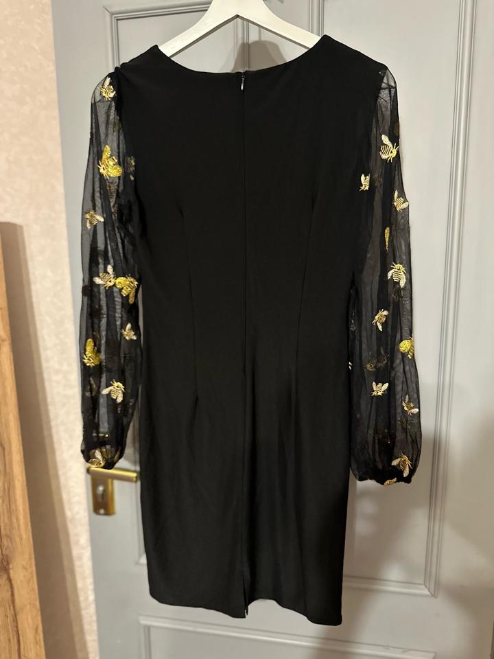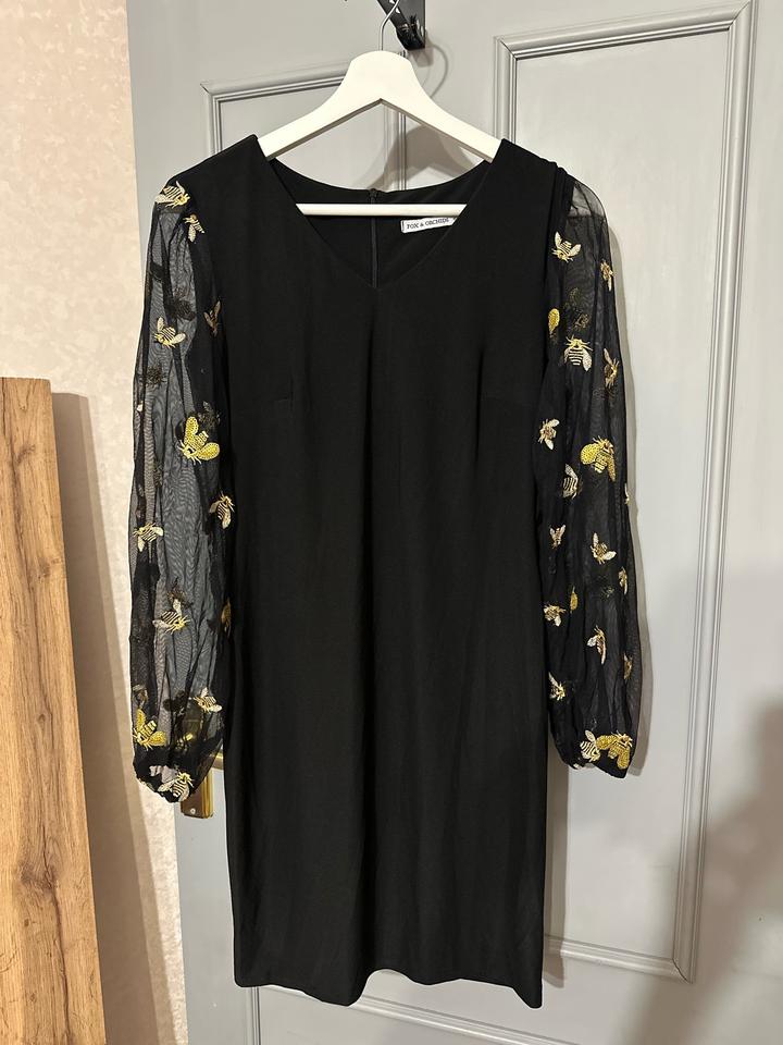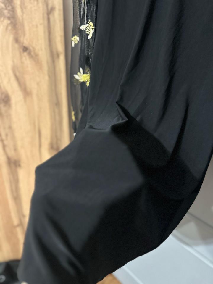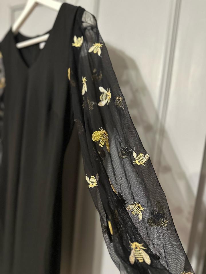 Элегантное чёрное платье с акцентными прозрачными рукавами. Рукава выполнены из лёгкой сетки с изысканной золотистой вышивкой в виде пчёл — эффектная деталь, которая делает образ особенным. V-образный вырез, комфортная длина, мягко садится по фигуре. Идеально для вечерних выходов и стильных мероприятий. Артикул: 447437