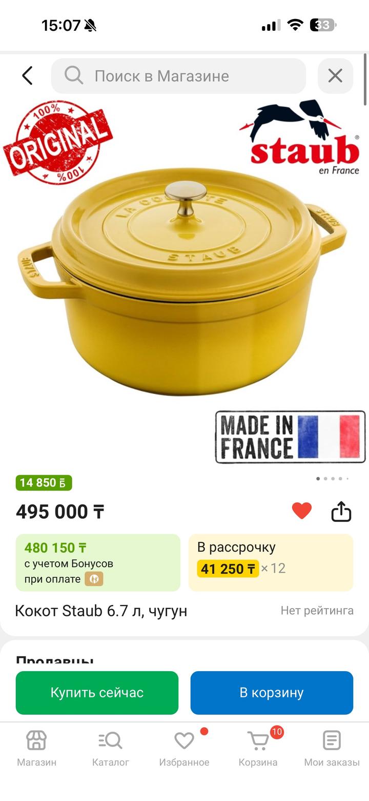 • Прочный чугун равномерно распределяет и долго удерживает тепло • Чёрная матовая внутренняя поверхность для идеальной обжарки и румяной корочки • Легко очищается и не требует прокаливания • Фирменные выступы на крышке удерживают влагу и усиливают вкус • Подходит для всех типов плит и выдерживает температуру в духовке до 260 °C (500 °F) • Произведено во Франции Оригинал. Могу показать чеки. Почти новый, готовила в нем пару раз. Артикул: 448460