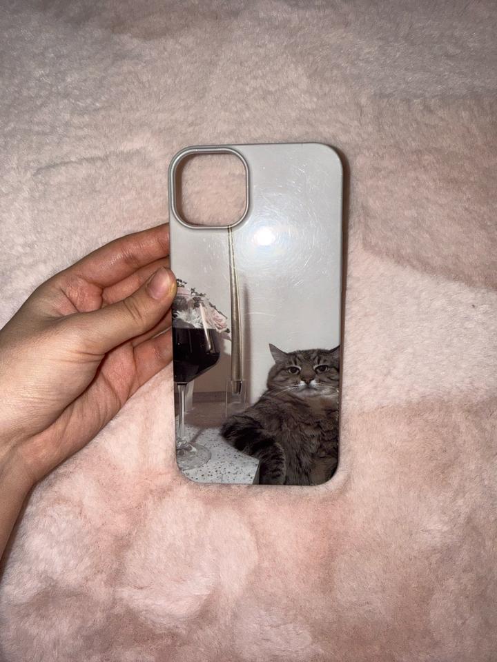 Чехол на Айфон 14 плюс. Дизайн «Мем с кошкой». Цвет светло-серый. Унисекс Артикул: 449523