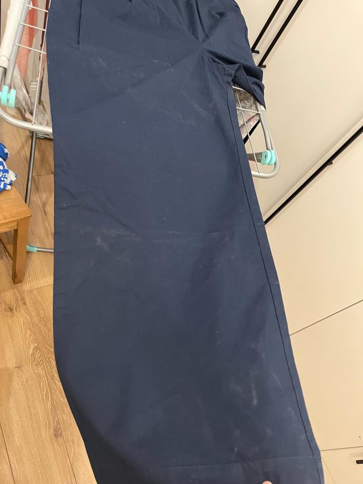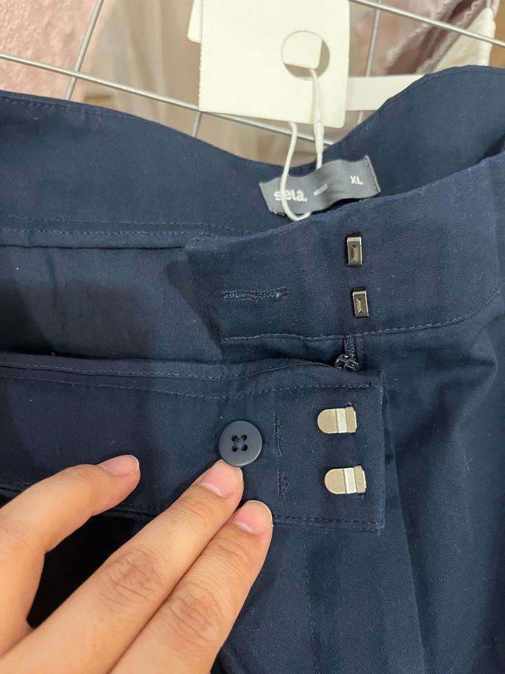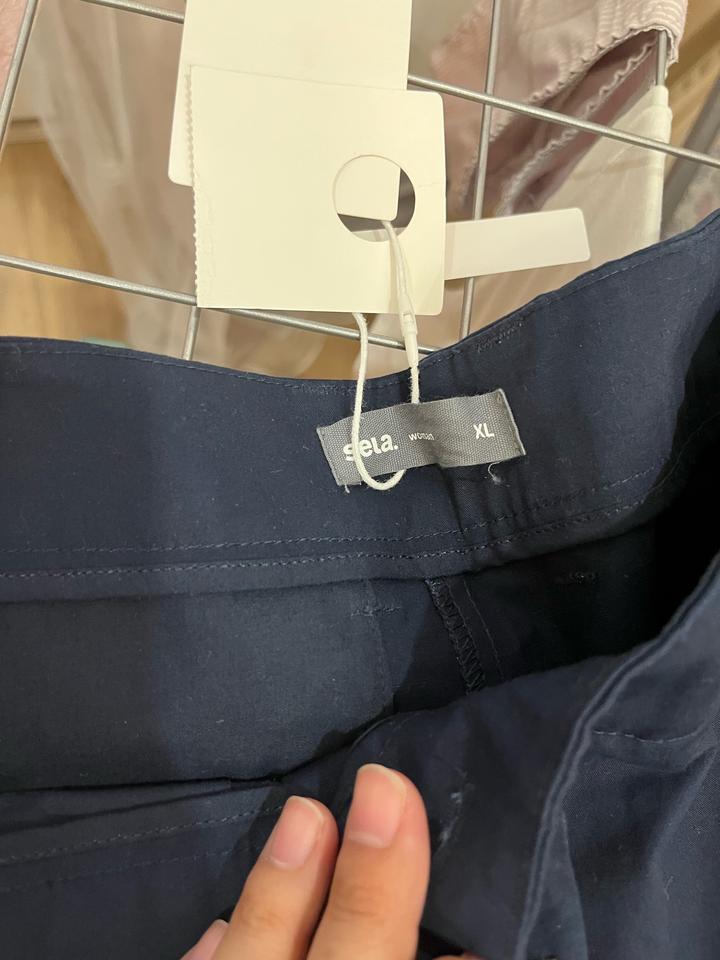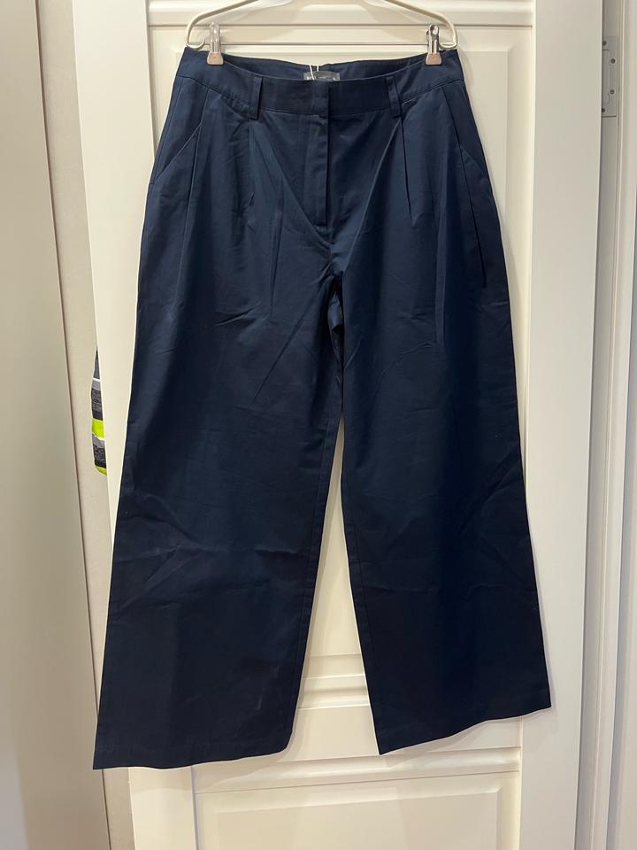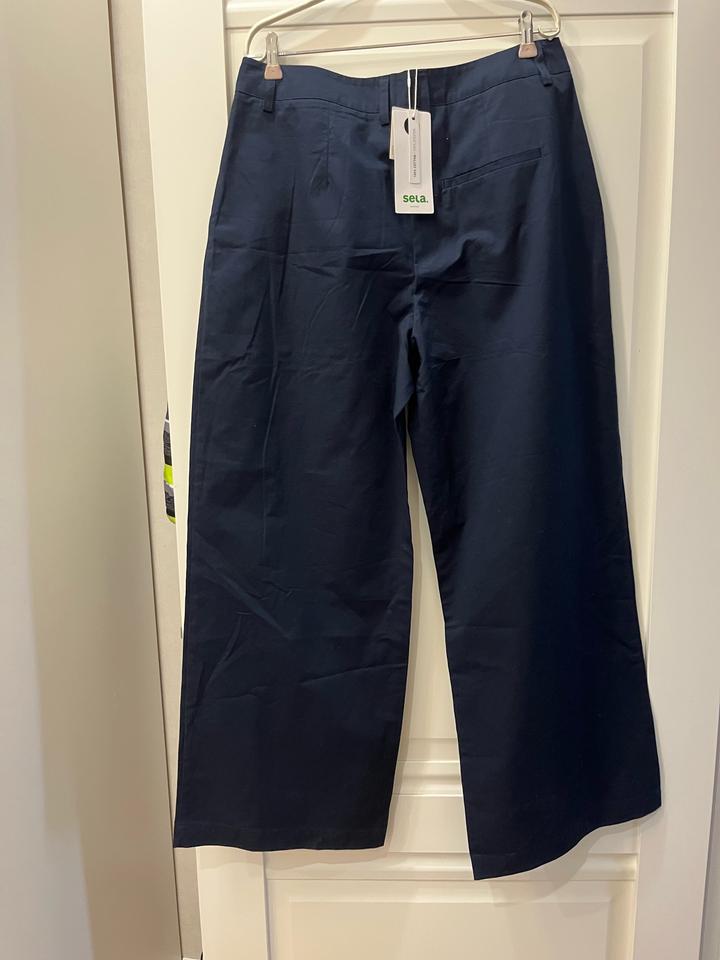 Новые женские широкие брюки бренда SELA с декоративными защипами у пояса. Плотная хлопковая ткань. Расслабленный крой с высокой посадкой талии. Пояс со шлевками для ремня. Застежка на молнию, крючки и внутреннюю пуговицу. Передние боковые карманы и декоративный прорезной карман с листочкой сзади. Полная длина. Чуть большемерят, подойдут скорее на 52 размер. Прошу внимательно просмотреть фото и описание: одна штанина немного грязная (при примерке/доставке), легко отстирается (снег). Артикул: 449693