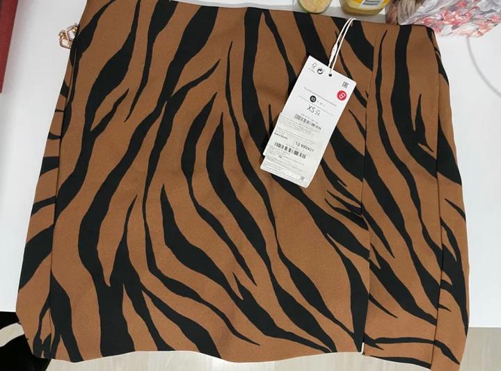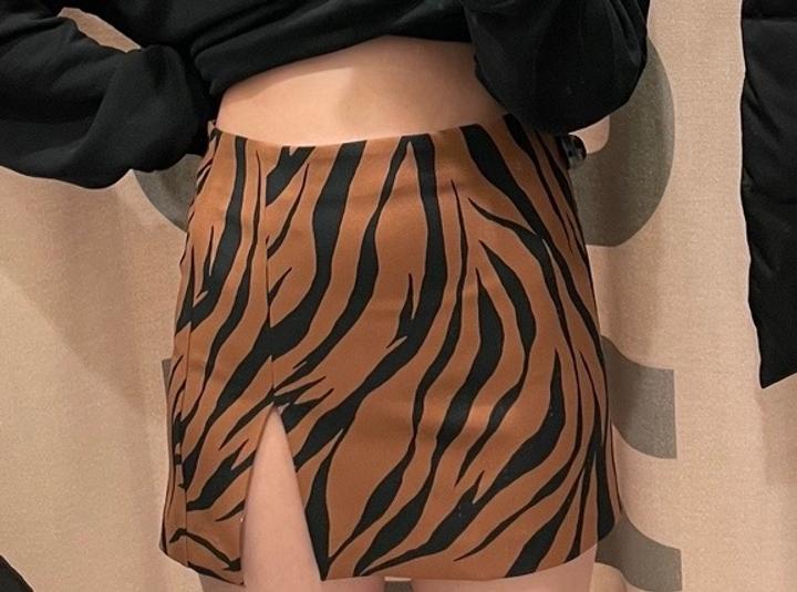 Юбка мини с тигровым принтом, размер XS. Модель на низкой посадке, на фото надета выше. Есть разрез спереди. Классно смотрится как с топами, так и с оверсайз-свитшотами. Артикул: 449728
