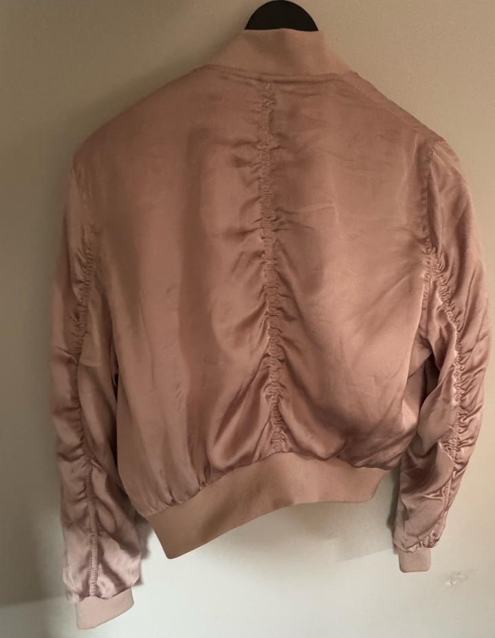 Куртка пудрово-розового цвета, вживую оттенок гораздо нежнее, чем на фотографии, камера немного искажает цвет. Материал что-то между атласом и шёлком, смотрится аккуратно и женственно. Сзади на рукавах есть сборка, также сборка проходит по спинке посередине, за счёт чего куртка красиво садится по фигуре. Карманы, молния и кнопки в полностью рабочем состоянии. Размер подойдёт на XS и S. Разгружаю гардероб, смотрите другие мои объявления. Артикул: 449847